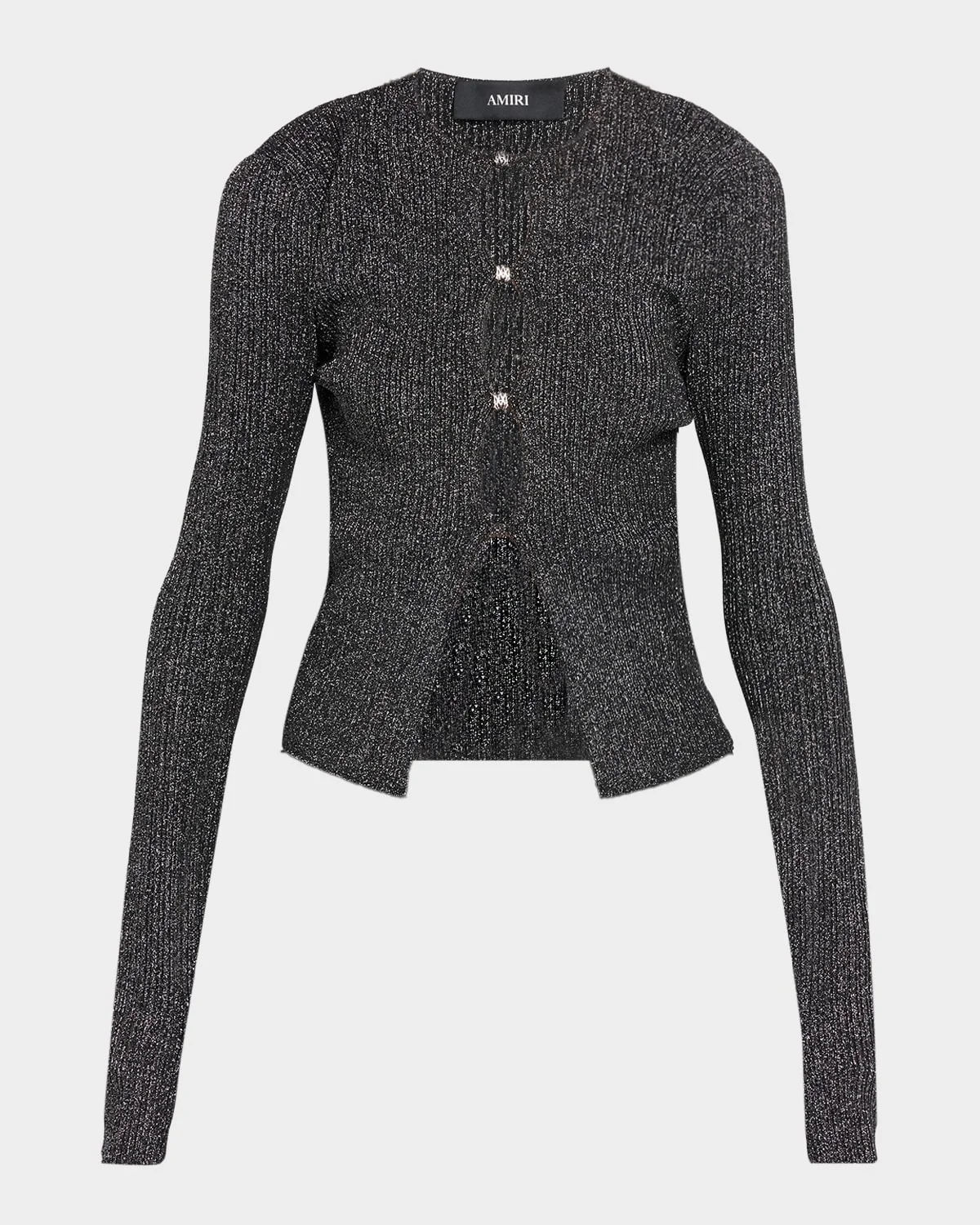 Crafted from metallic ribbed knit, this cardigan from Amiri features & nbsp;keyhole front & nbsp;details adorned with silvertone MA buttons Crew neckline; button front Long sleeves Fitted Hip length Viscose/nylon/polyamide/metallic fibers/elastane Do not iron, machine wash cold Made in Italy SIZE & FITModel measurements: 5 & apos;10" tallModel is wearing a US size 4/Small