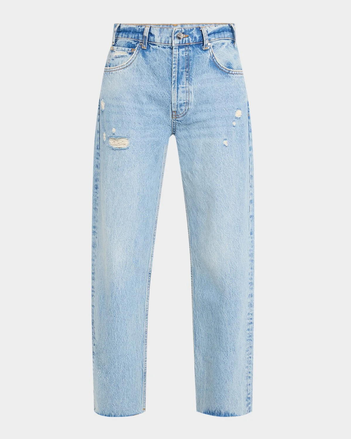 - ANINE BING "Gavin" distressed jeans with a raw hem in light-wash denim - High rise - Five-pocket style - Straight legs - Full length - Button/zip fly; belt loops - Cotton - Machine wash cold - Imported