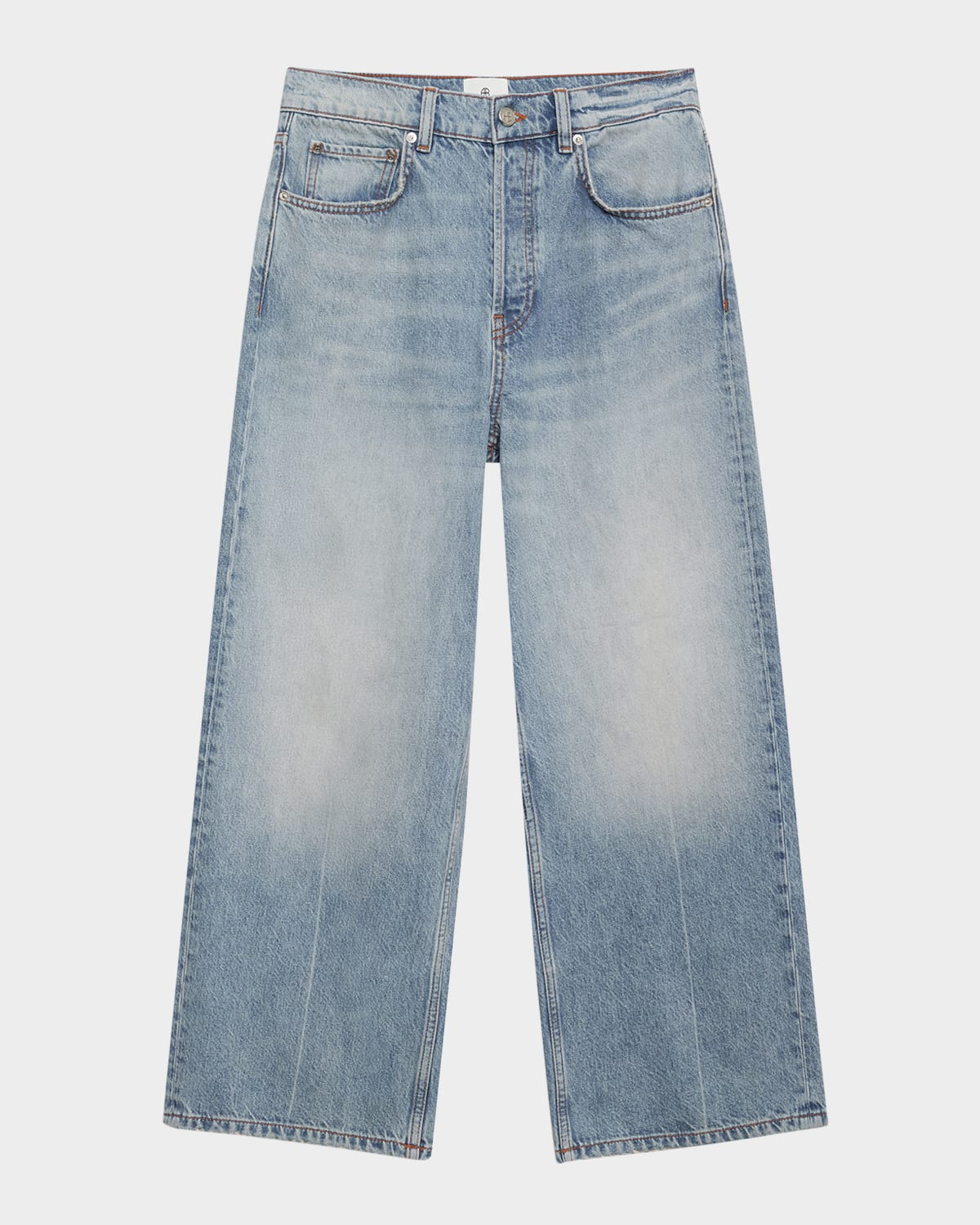 - ANINE BING "Heath" straight-leg jeans in faded medium-wash denim - Mid-rise; sits high on the hip - Five-pocket style - Relaxed fit - Full length - Button/zip fly; belt loops - Cotton - Machine wash - Imported