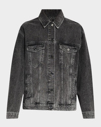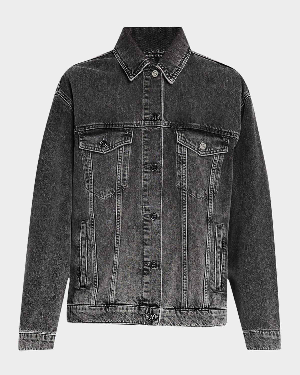 - ANINE BING "Rory" jacket in a midweight, rigid denim blend in a grey wash with vintage-inspired grinding and abrasions throughout - Spread collar - Long sleeves; button cuffs - Chest flap pockets - Side-entry welt pockets - Hip length - Oversized fit - Button front closure - Cotton - Machine wash cold - Imported