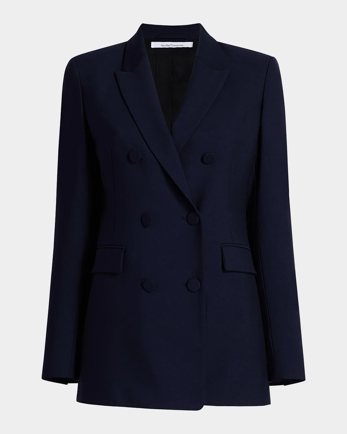 Another Tomorrow blazer jacket with a button-front styling & nbsp; Approx. 29.4" from shoulder to hem & nbsp; Double-breasted front & nbsp; Peak lapel collar & nbsp; Long sleeves & nbsp; Side flap pockets & nbsp; Mid-length & nbsp; Relaxed fit & nbsp; Custom-made ethical merino wool Merino wool Lining: Cupro Made in Italy Fashioned for change: responsible manufacturing. Find out more here