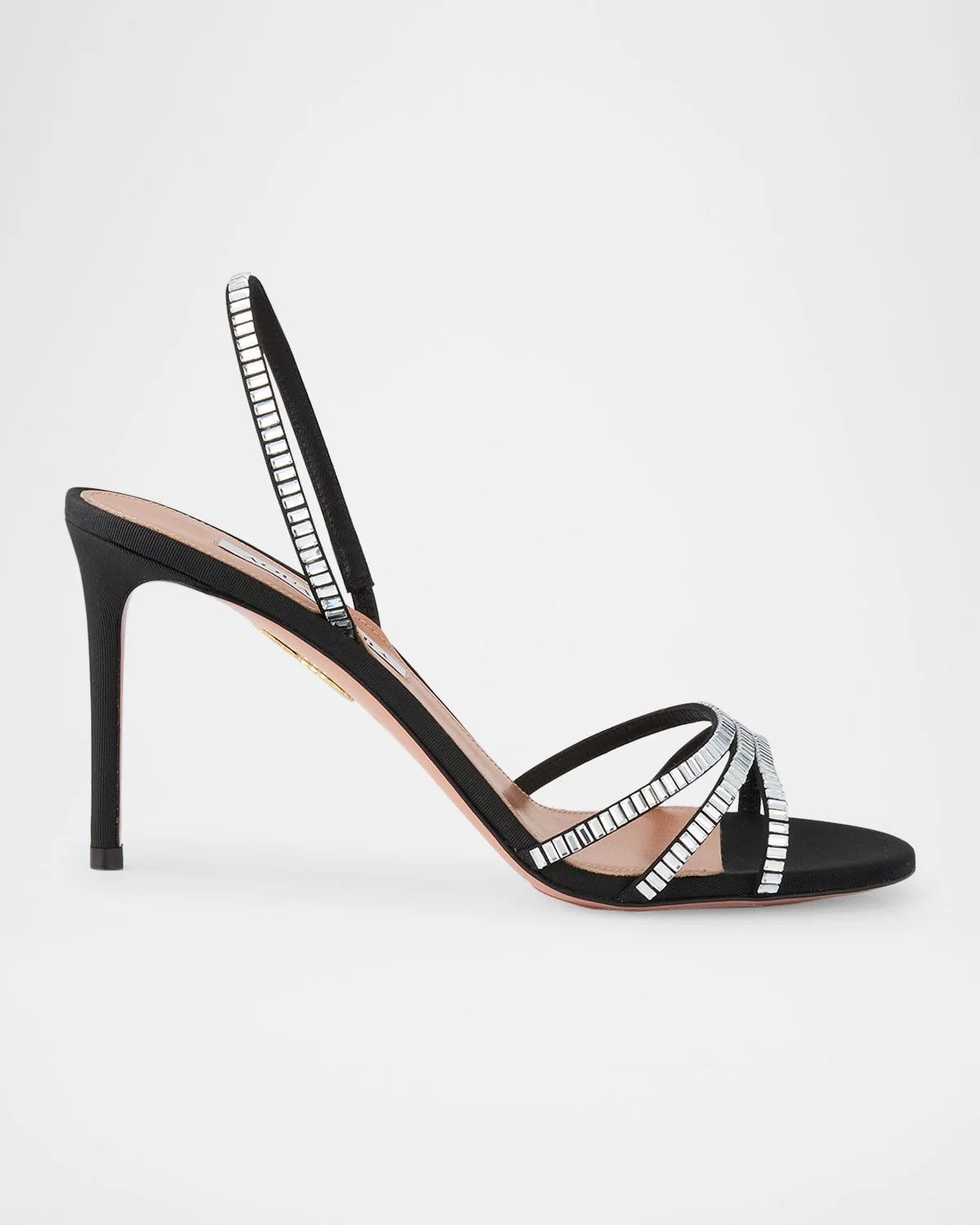 - Aquazzura "Memoire" viscose grosgrain sandals adorned with crystal embellished detailing - 3.25 in / 85 mm covered stiletto heel - Open toe - Strappy toe vamp - Elastic halter slingback strap - Leather outsole - Lining: Goat leather - Made in Italy