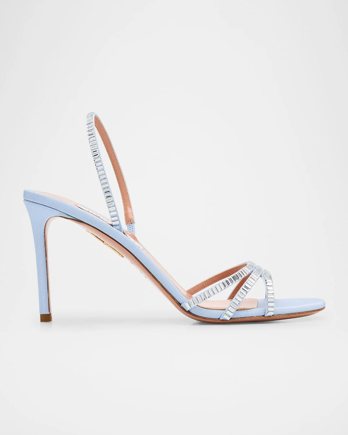 - Aquazzura "Memoire" sandals in viscose grosgrain with crystal-embellished straps - 3.25 in / 85 mm stiletto heel - Almond open toe - Elastic slingback strap - Leather outsole - Lining: Goat leather - Made in Italy