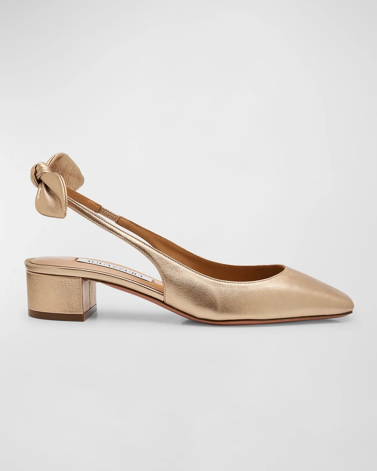 - Aquazzura metallic leather ballerina pumps - 1.38 in / 35 mm block heel - Square toe - Stretch slingback with knotted bow accent - Leather outsole - Lining: Goat leather - Made in Italy
