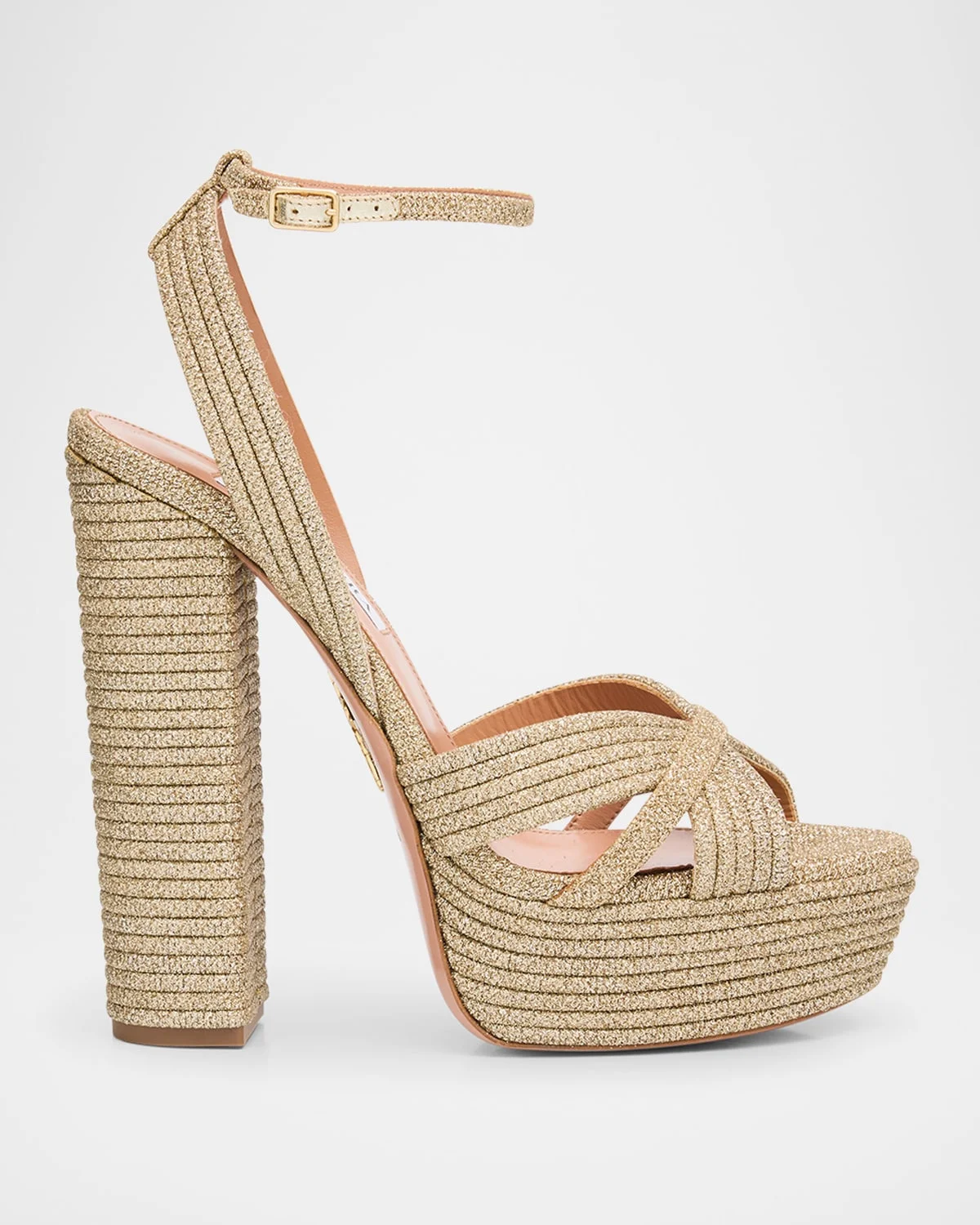 - Aquazzura "Sundance" platform sandals in braided lurex cotton - 5.50 in / 140 mm covered block heel - Peep toe - Caged crisscross vamp - Adjustable ankle strap - Leather outsole - Lining: Goat leather - Made in Italy