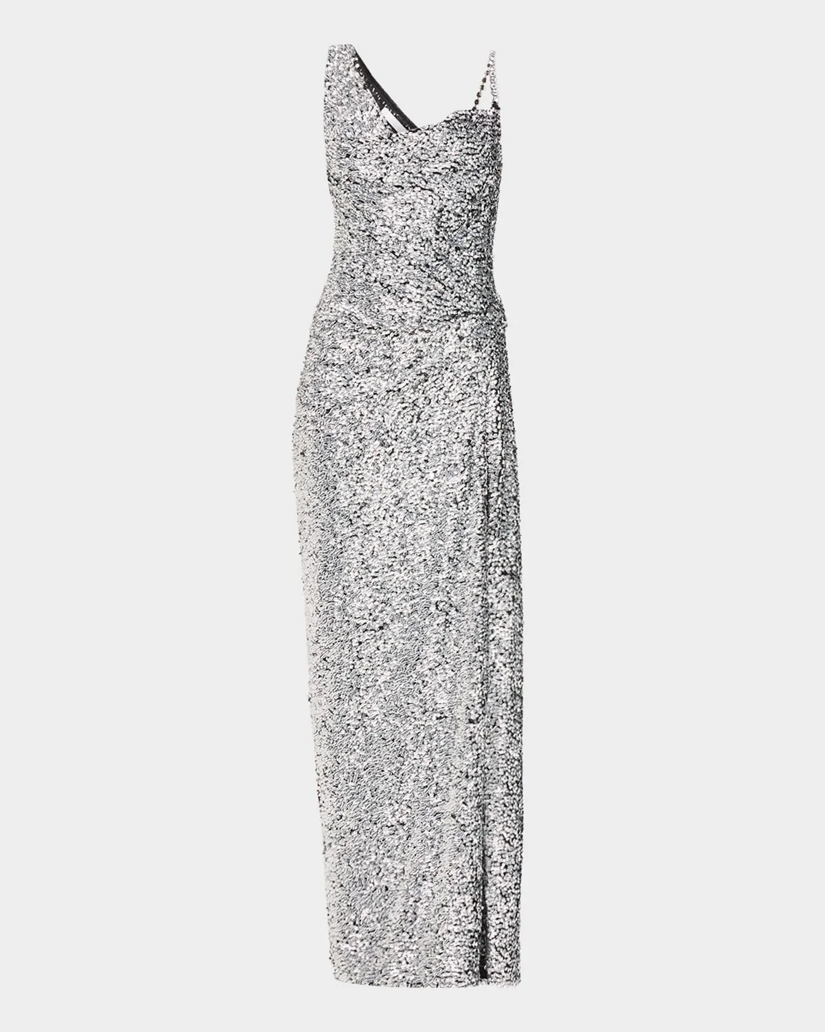 Crafted with silvertone sequins creating a shimmering effect, this evening gown from AREA is finished with an asymmetric neckline and a dramatic thigh-high slit. Asymmetric neckline and back Sleeveless; fixed crystal chain strap Gathered detail on the left hip Column silhouette Floor-length hem Thigh-high slit Slipover style Viscose/nylon/polyamide/elastane Imported SIZE & FITModel measurements: 5 & apos;10" tallModel is wearing a US size 4/Small