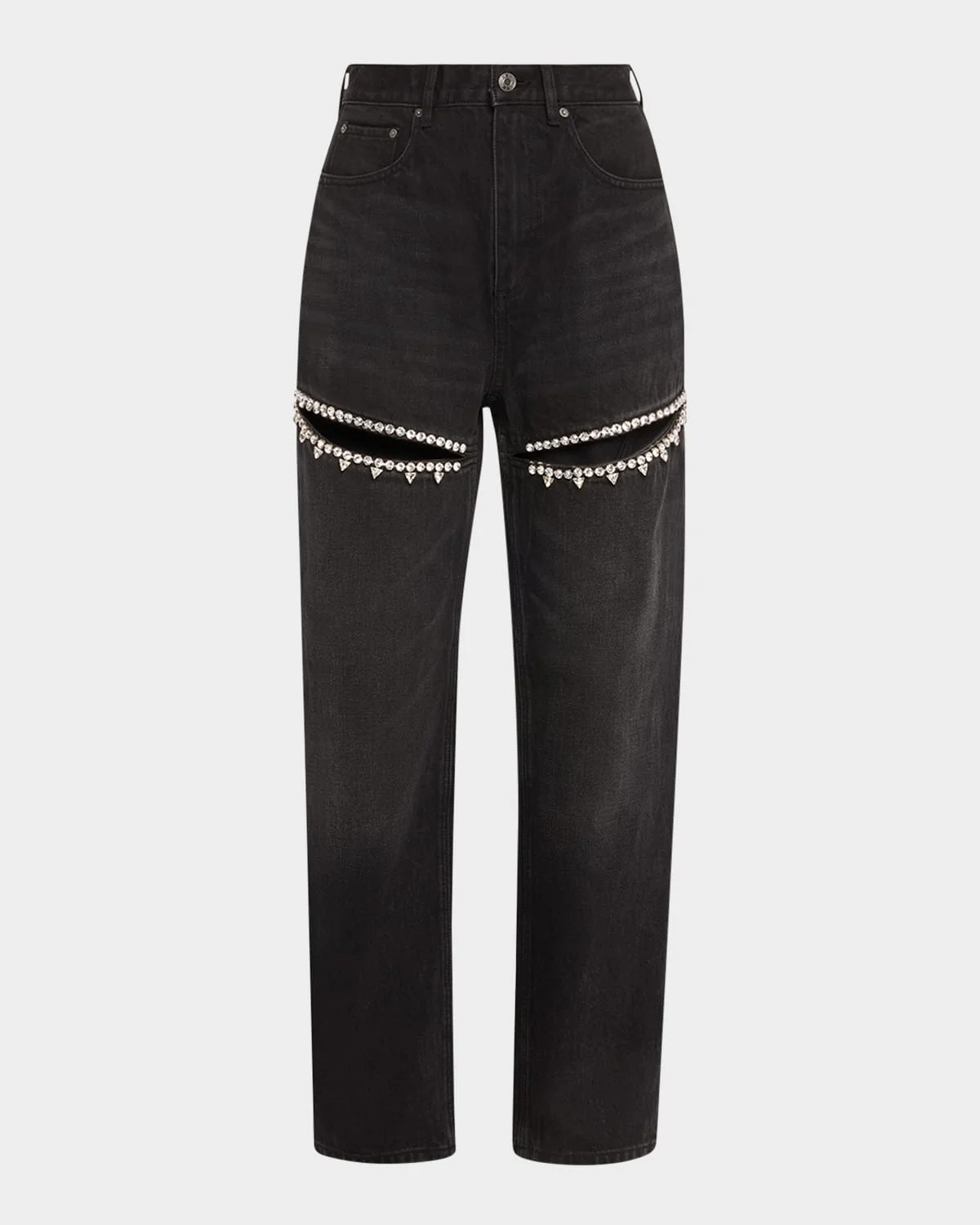 Area denim jeans feature slit details with shiny crystal embellishment trim & nbsp; Mid-rise; sits high on the hip Button/zip fly; belt loops & nbsp; Five-pocket style & nbsp; Straight legs & nbsp; Full length Cotton Dry clean Imported