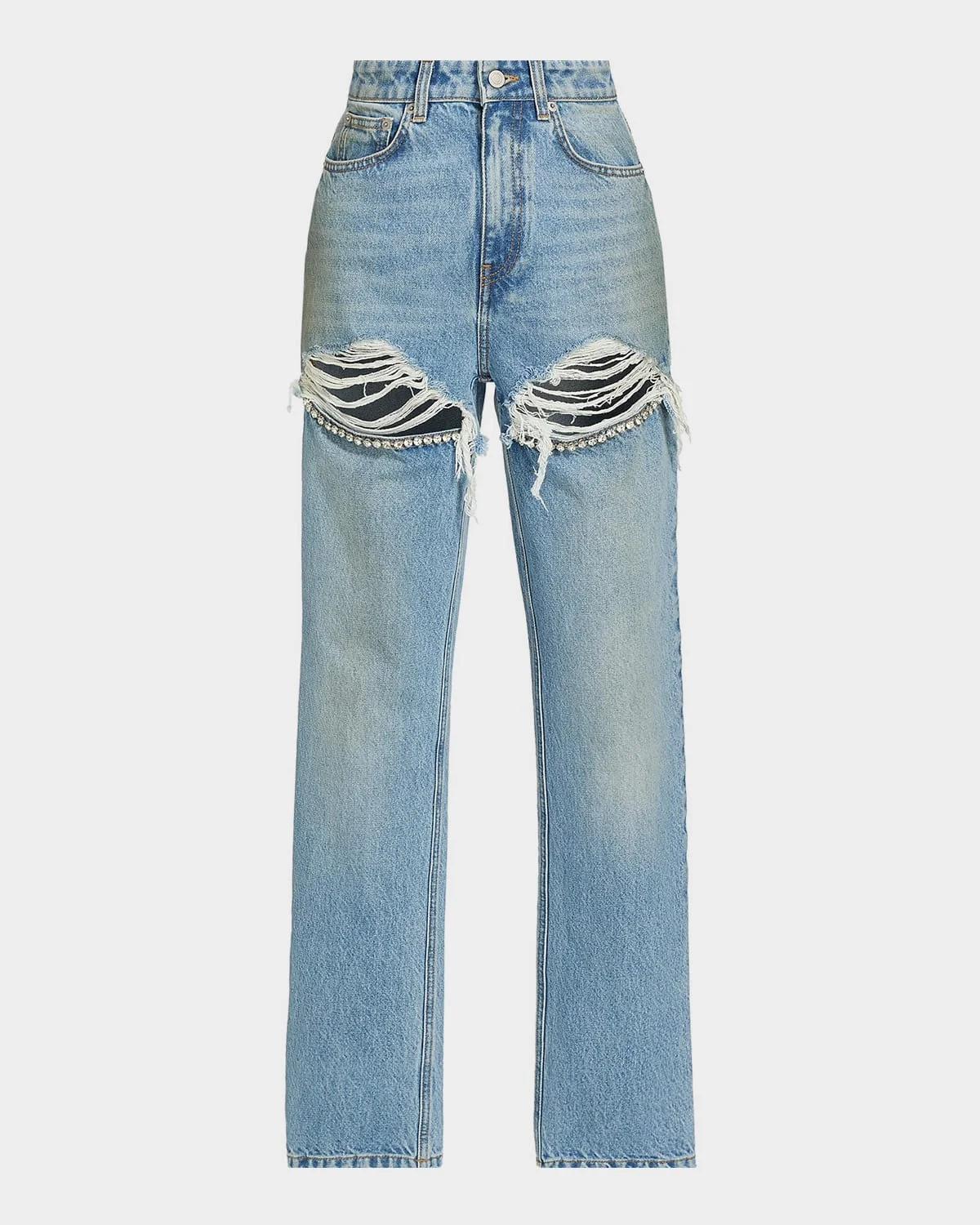 Crafted from light-washed denim, these jeans & nbsp;from AREA feature & nbsp;crystal-embellished frayed & nbsp;slits on the front thighs High rise Five-pocket style Barrel legs Full length Button/zip fly; belt loops Cotton Imported SIZE & FITModel measurements: 5 & apos;10" tallModel is wearing a US size 4/Small