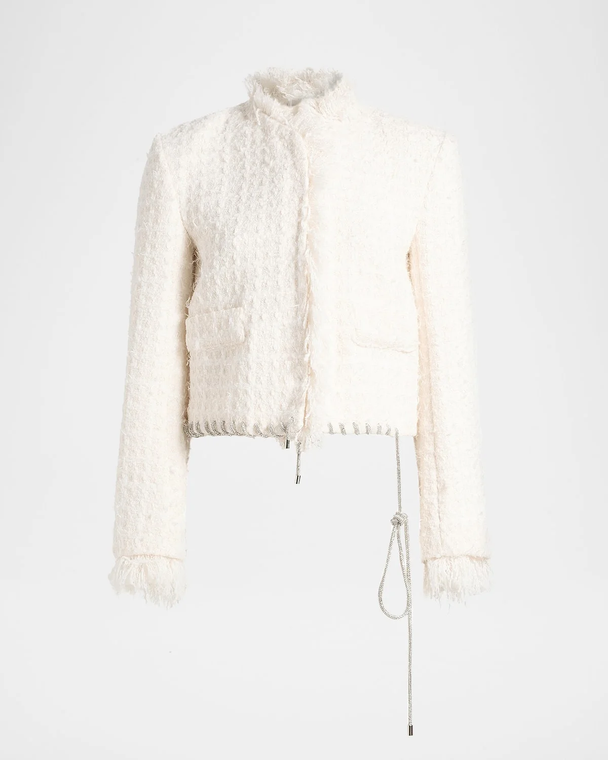 AREA lady jacket is crafted from eyelash tweed, finished with fringed edges and a crystal lace stitched hem Round neckline; single-breasted front Long sleeves Padded shoulders Hip welt pockets Straight fit Hip length Wool Imported