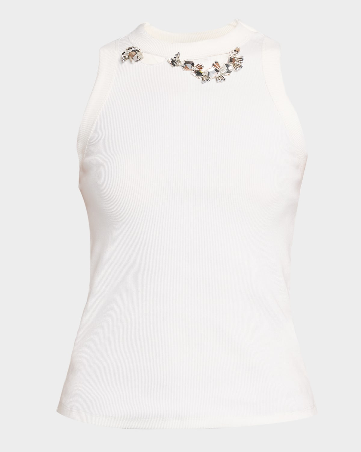 - AREA ribbed knit tank top with crystal embellished distressing along the neckline - Crew neckline - Sleeveless - Fitted - Pullover style - Polyester/polyurethane - Imported