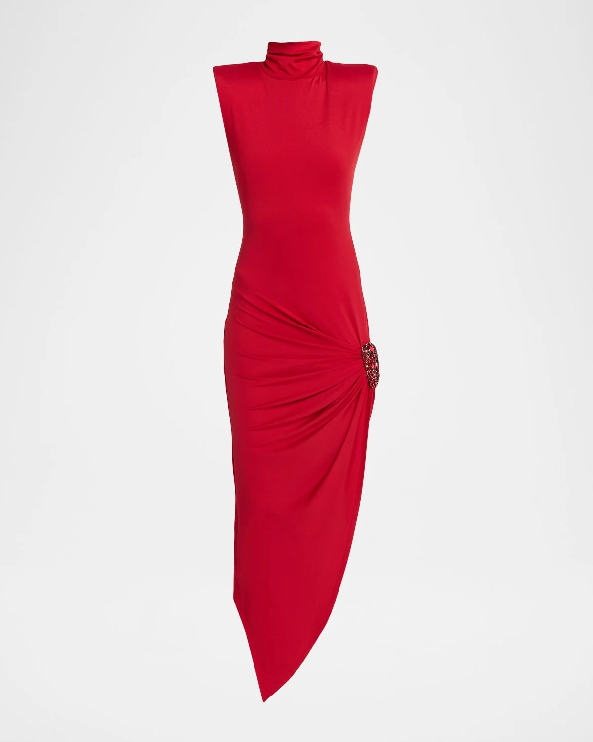 Gathered pleating on & nbsp;the hip is sealed with crystal-embellished hardware for & nbsp;this modern dress from & nbsp;AREA, finished with an asymmetric hem that contrasts from the front to back. High neckline Sleeveless Crystal cluster on the left hip Sheath silhouette Asymmetric hemline Below-the-knee length Hidden back zipper Polyester/elastane Dry clean Imported SIZE & FITModel measurements: 5 & apos;10" tallModel is wearing a US size 4/Small