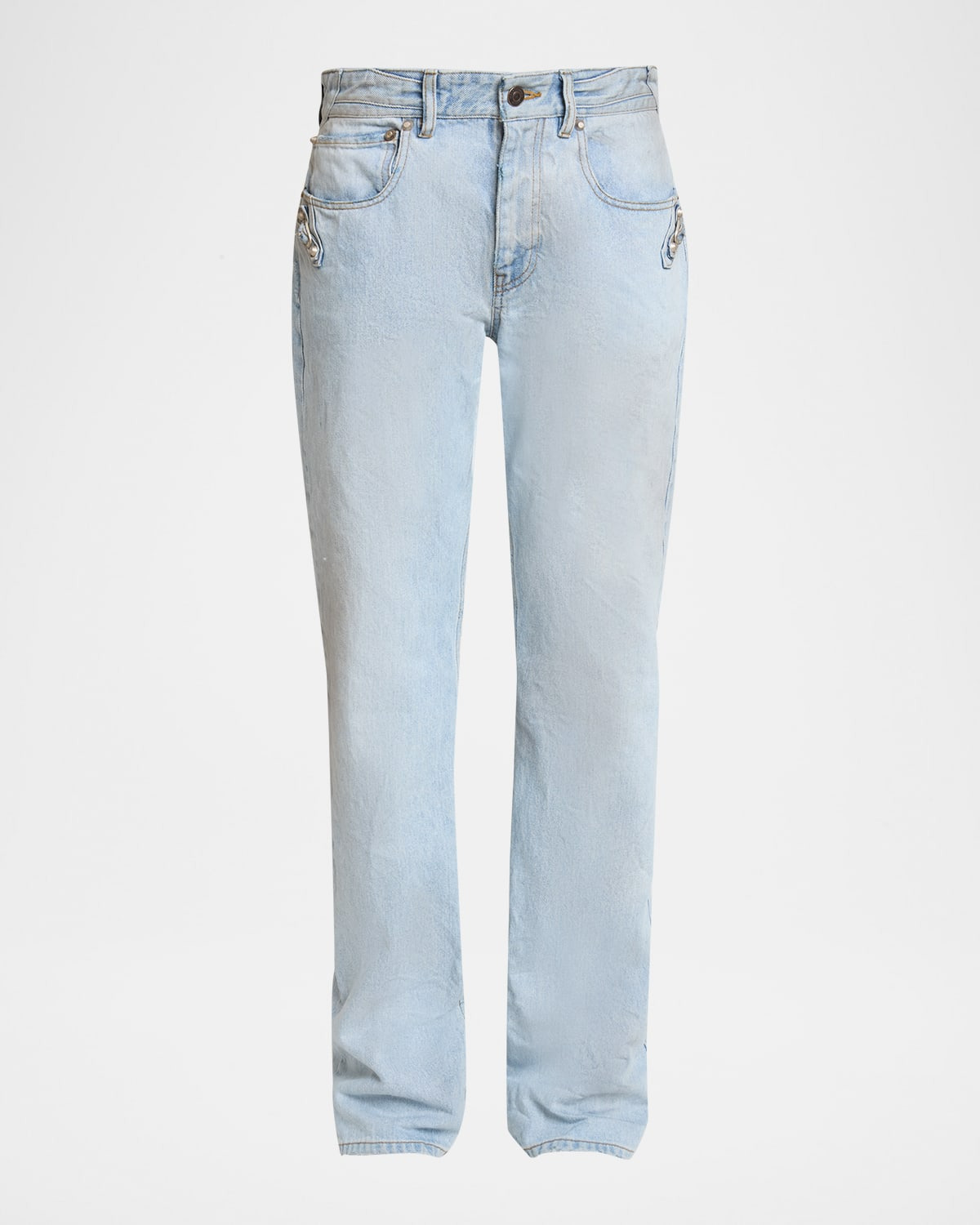 Balenciaga "City" jeans are crafted of lightwash denim embellished with signature studs, buckles, and slightly distressed edges Mid rise sits high on hip Fivepocket style Straight legs Full length Button/zip fly; belt loops Cotton Professional cleaning recommended Made in Japan