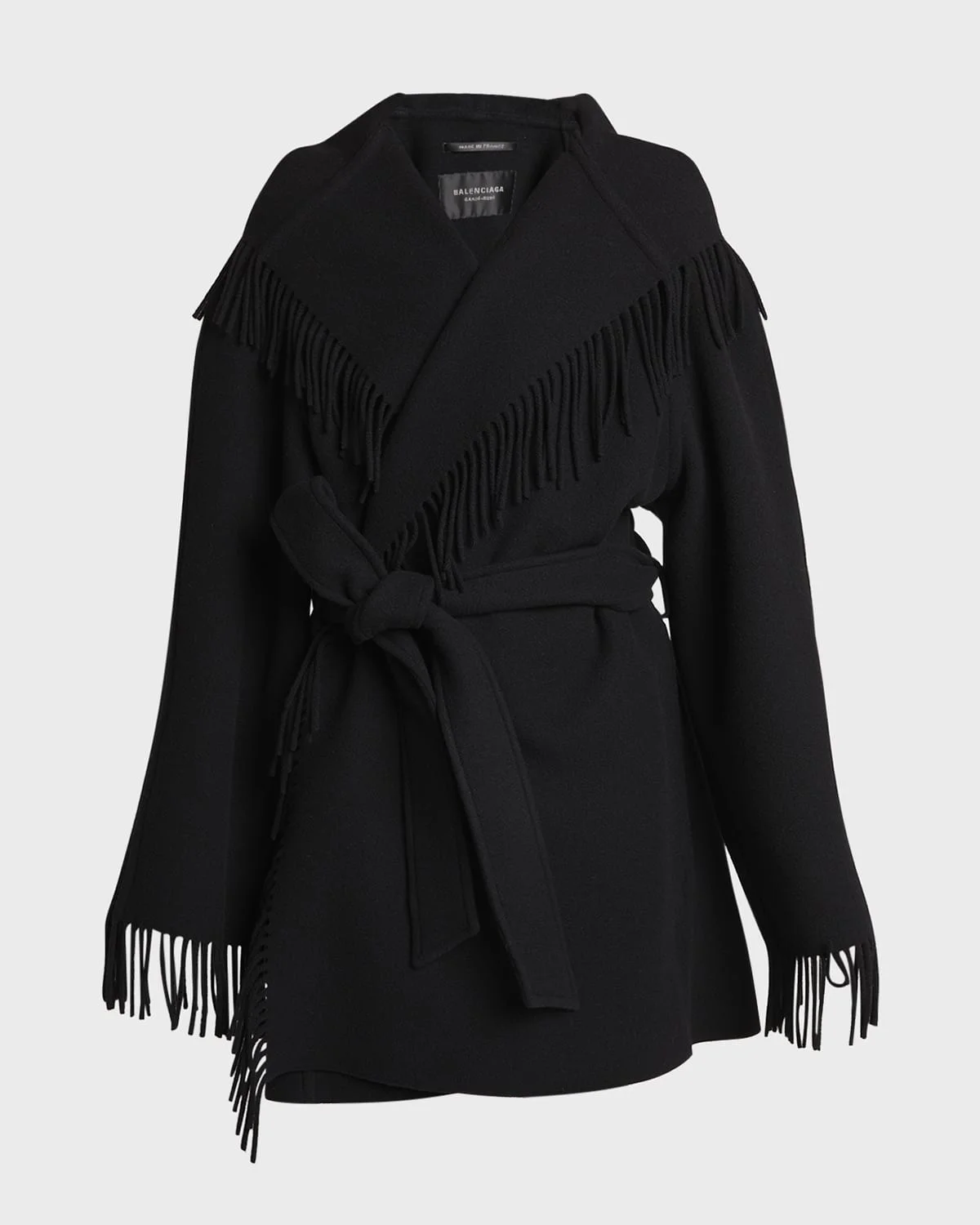 Balenciaga brushed wool wrap jacket featuring fringed edges Hooded neckline; open front Long raglan sleeves Selftie belted waist Side slip pockets Oversized fit Virgin wool Dry clean Made in Italy
