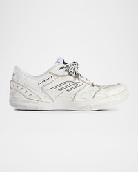 Balenciaga "Hamptons" lowtop sneakers are crafted of calfskin leather and polyester, featuring a wornout effect and script printed laces Reinforced round toe Laceup vamp Raw edge and visible stitching on the upper Balenciaga logo debossed on the upper 3B sports icon artwork in rubber on sides Loop sports icon logo on the tongue and backstay Written size debossed on the upper and backstay Cushioned footbed Balenciaga logo embossed rubber outsole Imported