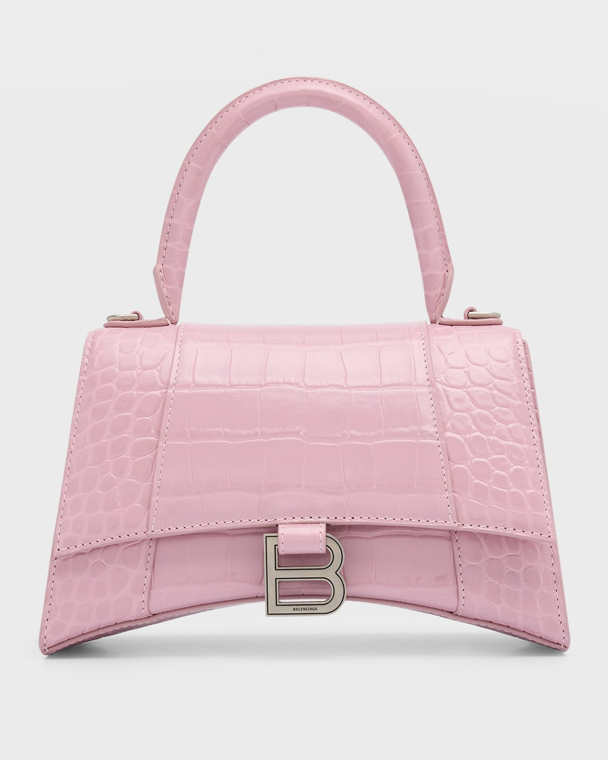 - Balenciaga top-handle bag in shiny crocodile-embossed calfskin. - Rolled top handle. - Removable, adjustable crossbody strap 21.6" - Flap top with hanging "B" hardware; snap closure. - Exterior, slip compartment at back. - Interior, one slip pocket. - Item weighs approx. 1.3 lb./ 0.6 kg. - 5.5"H x 9.1"W x 3.9"D. - Made in Italy.