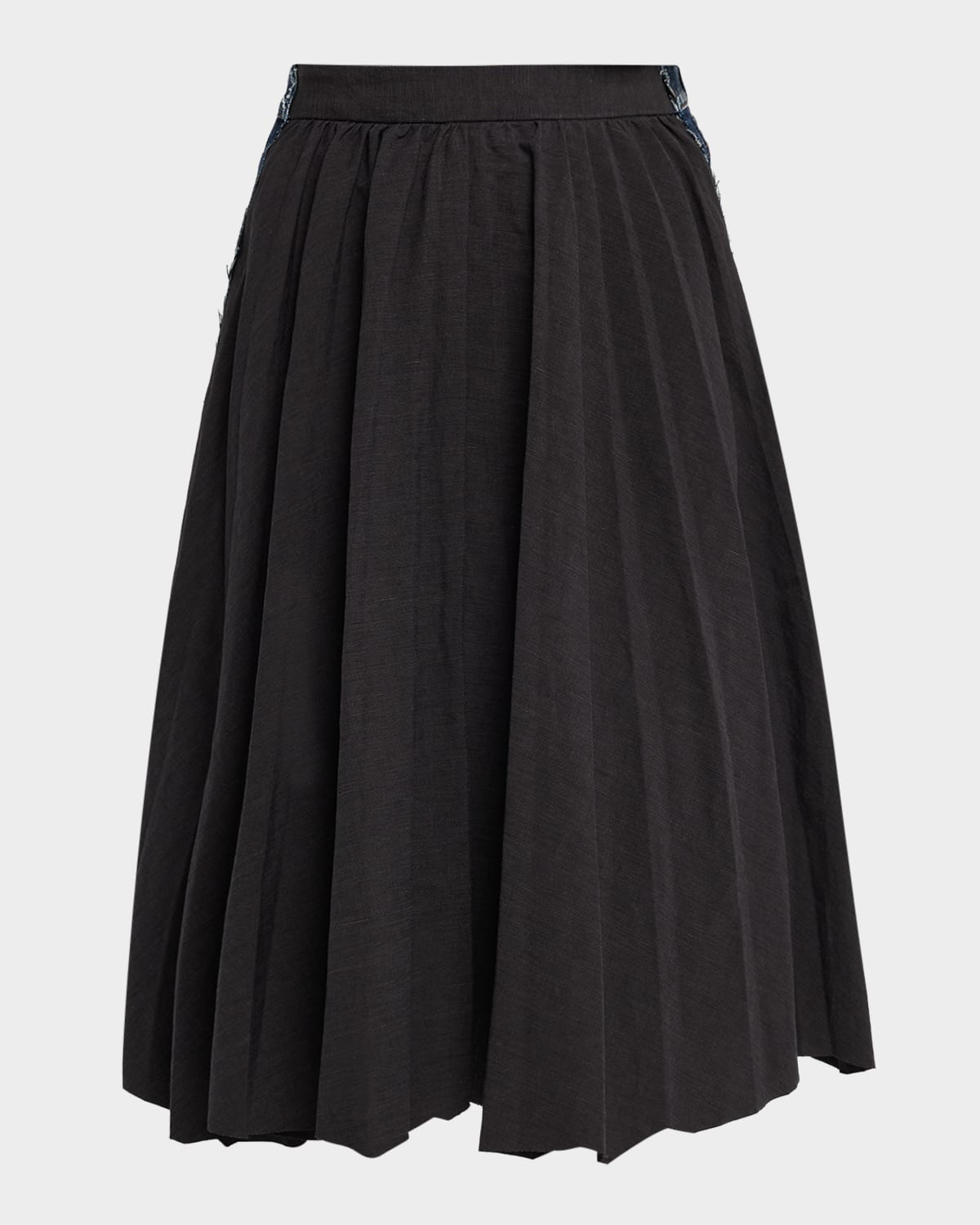 Balenciaga hybrid skirt in a pleated linen front and a faded medium wash denim back with a raw hem Mid waist Back patch pockets Logo patch on the back Hem falls below the knee Aline silhouette Side zip Linen/cotton Hand wash, machine wash line dry Made in Italy