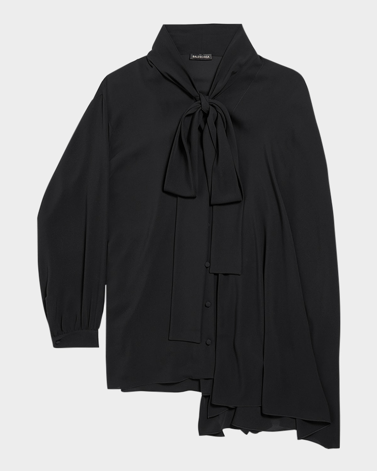 - Balenciaga scarf blouse fetauring an asymmetric cape-like shoulder - Band collar; self-tie front - Long sleeves; unfinished cuff - Loose fit - Shirttail hem - Silk - Hand wash, machine wash line dry - Made in Italy