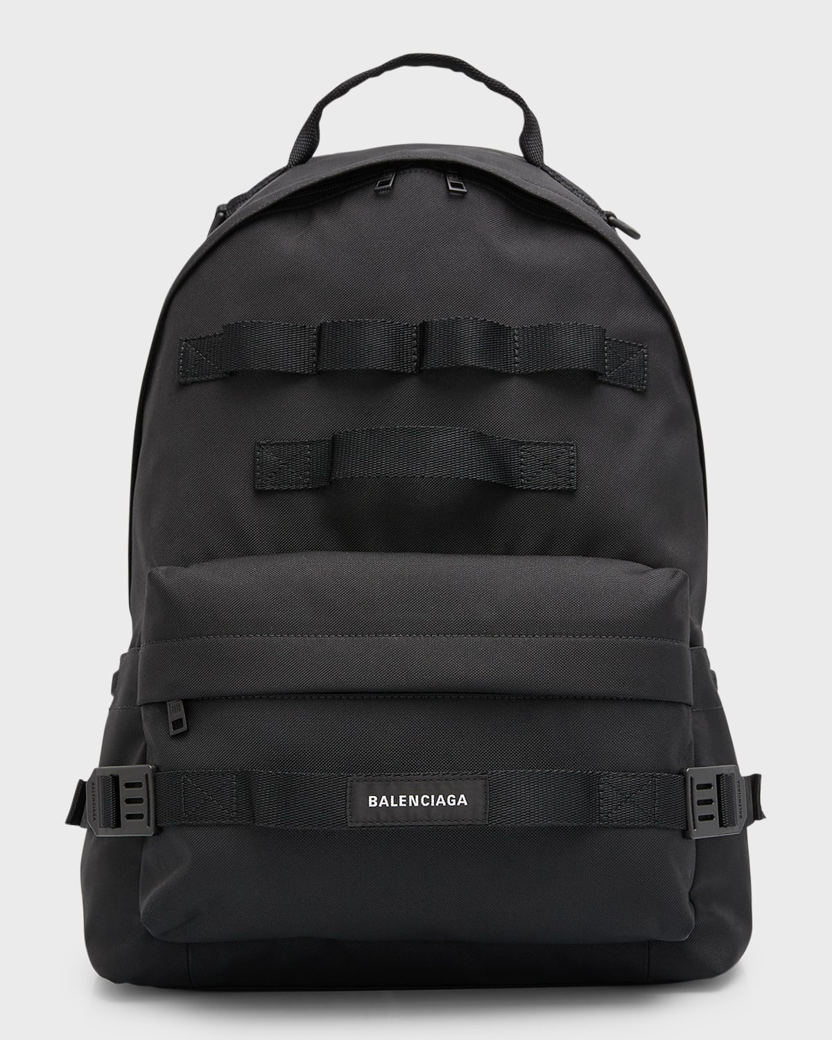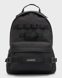 - Dimensions: L13 x H18,1 x W4,7 inch - Recycled nylon - Backpack - One top handle - Two hooks - Adjustable shoulder straps - Adjustable and removable crossbody strap (18,9 inch) - Balenciaga logo patch at front - Tone-one-tone hardware - MOLLE loop system and hooks - Top double-ended zip-fastening closure - Front zipped pocket - Inner patch pocket - BB engraved zipper puller - Cotton canvas lining - Made in Italy - Wipe with a soft cloth