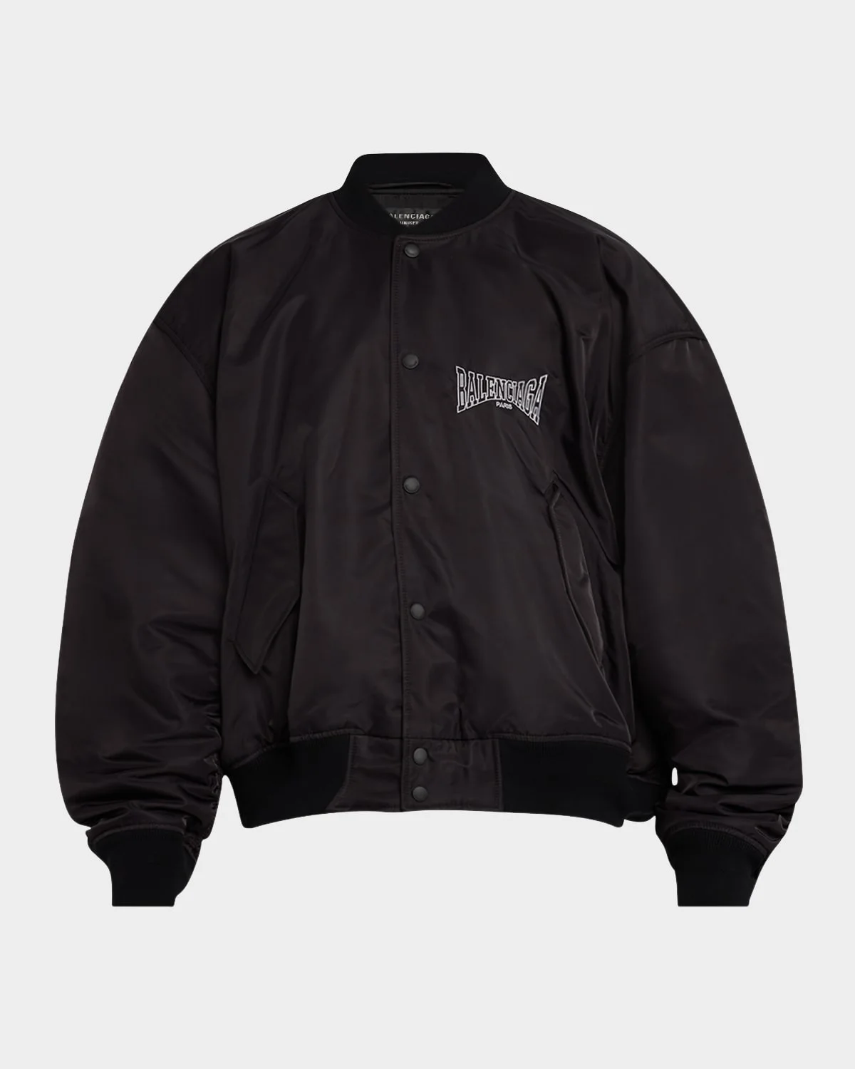 Balenciaga varsity jacket with embroidered chest logo Rib-knit collar, cuffs and waistband Snap front closure Side pockets with flap closure Oversized fit Nylon/polyamide Lining: Cupro Made in Italy Model is 6'1"/185cm.