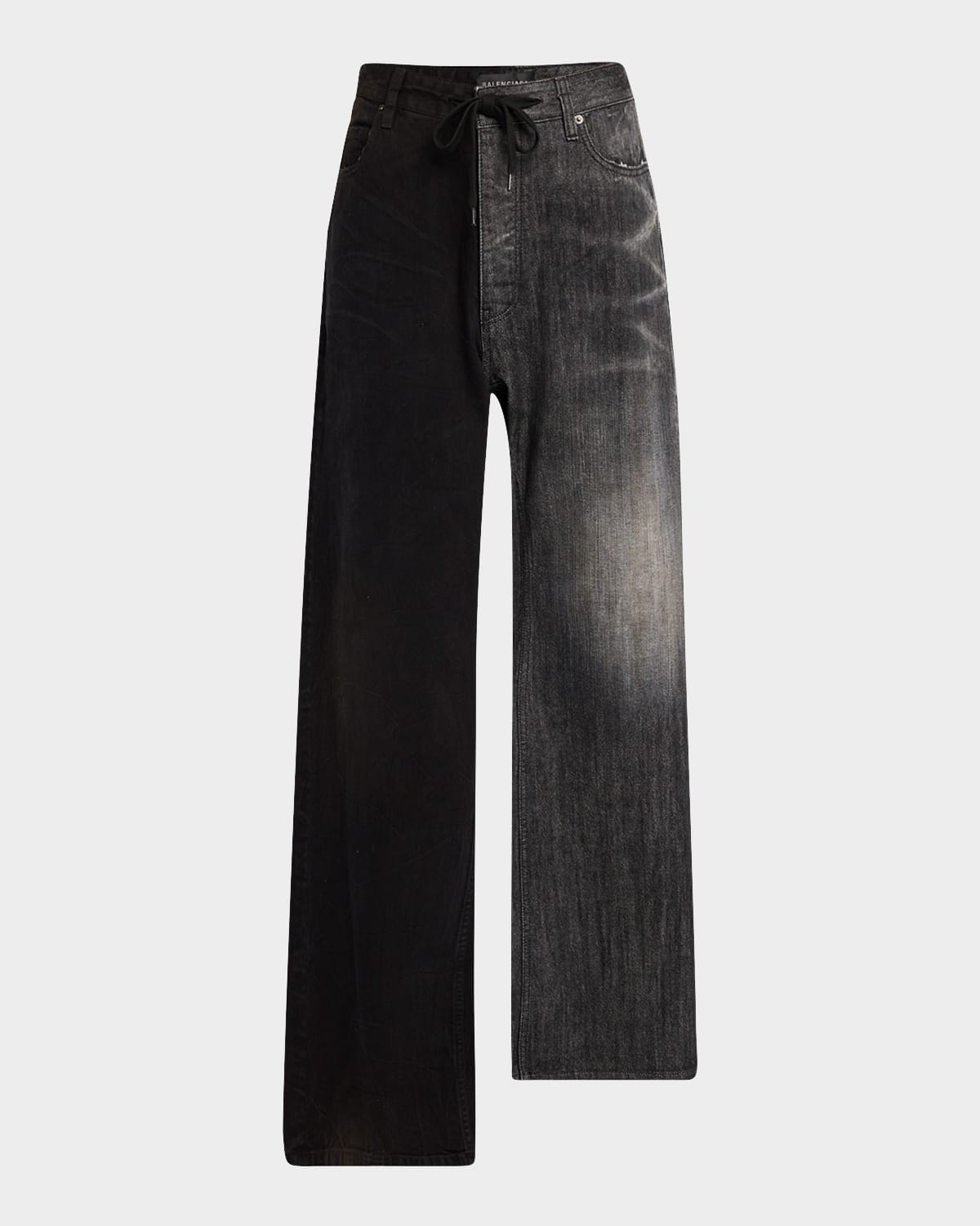 - Balenciaga jeans in 50/50 solid black denim and washed black denim - Regular rise - Button/zip closure - Adjustable drawstring at waist - Five-pocket style - Full length - Flared legs - Cotton - Made in Japan - Model is 6'1"/185cm.