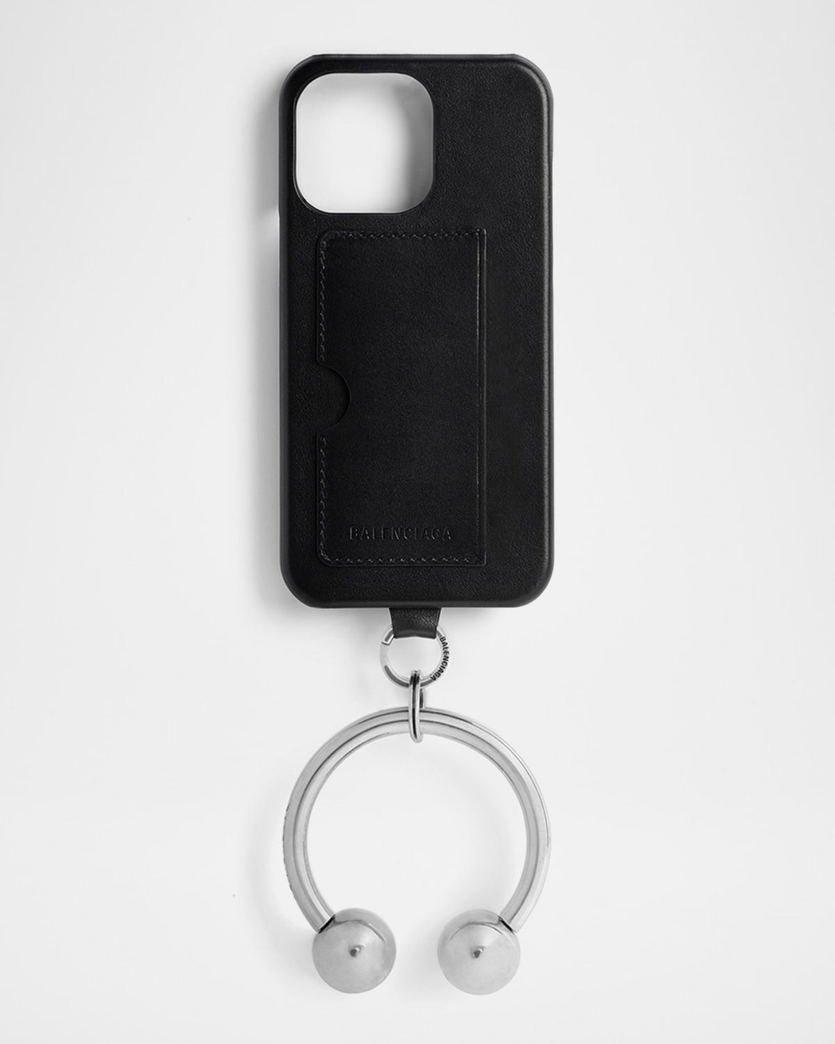 Balenciaga phone case in smooth calfskin and brass Features one removable bracelet with one fixed and one screwable ball One card slot with tonal debossed logo Agedsilver hardware Fits iPhone 16 Pro Max Approx. 2.5" internal diameter; 0.9" opening Made in Italy