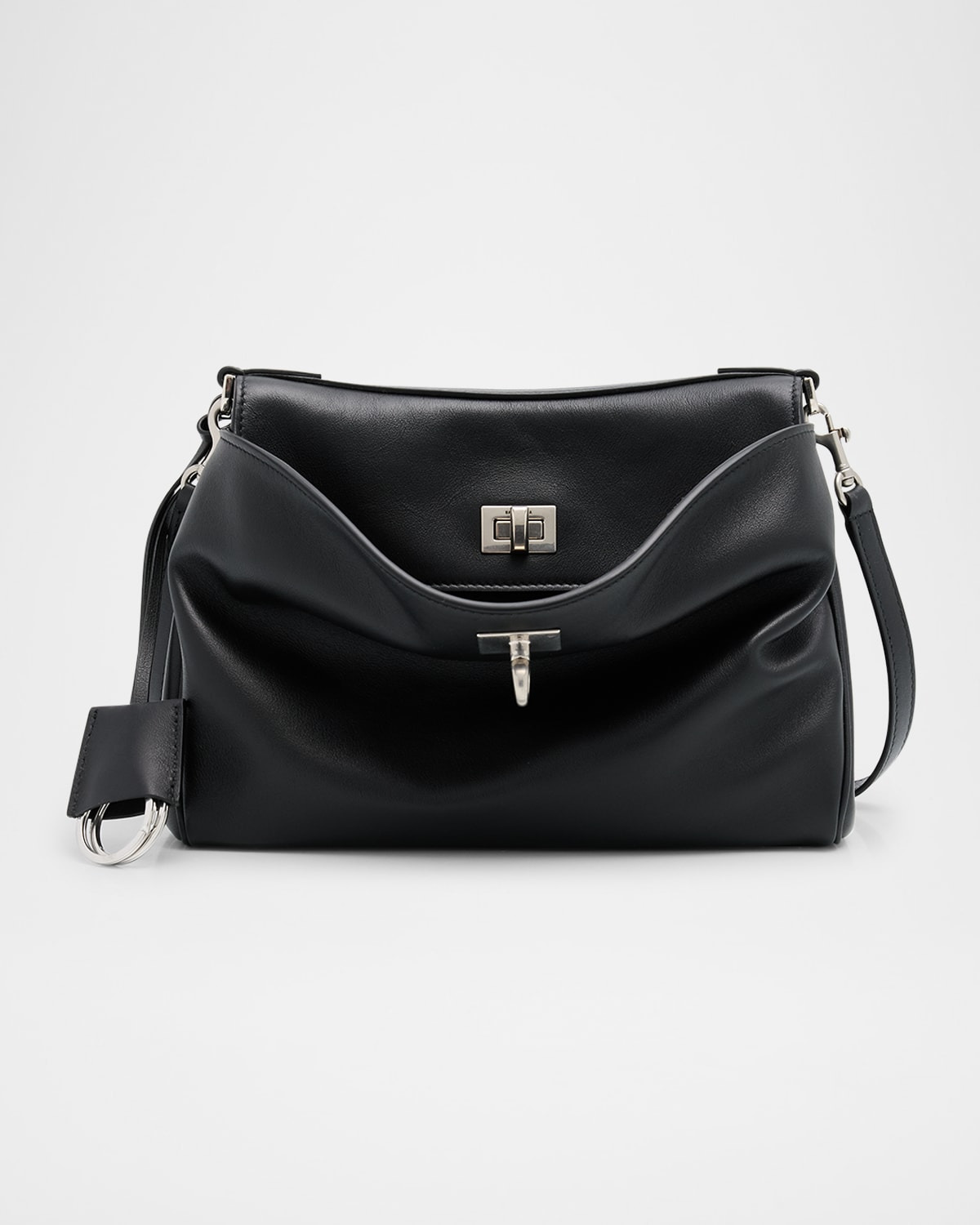 - Balenciaga small messenger bag in smooth calfskin for a classic finish - Adjustable detachable webbing shoulder strap - Can be styled by crossbody or shoulder - Aged-silvertone hardware - Flap top - Turn-lock closure - Exterior, two back flat pockets - Interior, one main compartment, one zip pocket - Leather lining - Removable cloche cle with two split rings - Side snaps - Leather/polyester - Approx. 6.7"H x 9.6"W x 4.3"D - Made in Italy