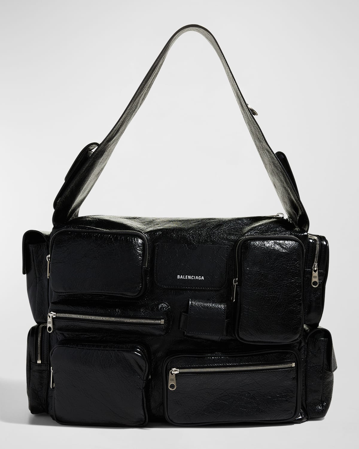 - Balenciaga "Superbusy" large sling bag featuring external multi-pocket organization - Approx. 16.5"L x 7.4"W x 11.4"H - Zip closure - Embossed logo at front - One shoulder strap with D-ring - Two flap pockets at strap - One card slot; one flap pocket; five zip pockets at front - Two flap pockets; two zip pockets at sides - One zip pocket; one D-ring with logo lettering at back - Canvas lining - Wipe clean - Lambskin leather - Made in Italy