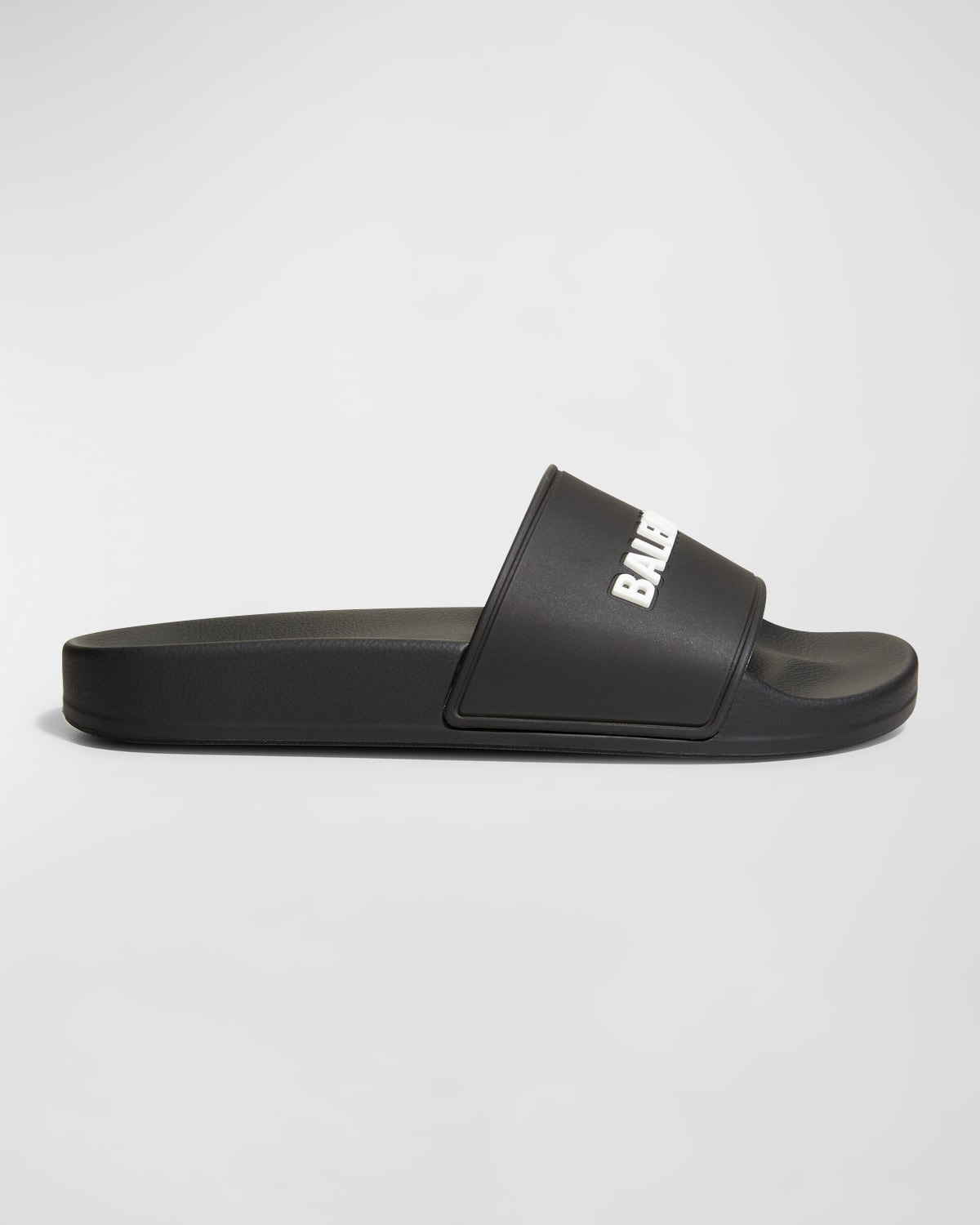 - Balenciaga rubber pool slide with contrast logo upper. - 1" flat heel. - Open toe. - Molded footbed. - Textured outsole. - Made in Italy.