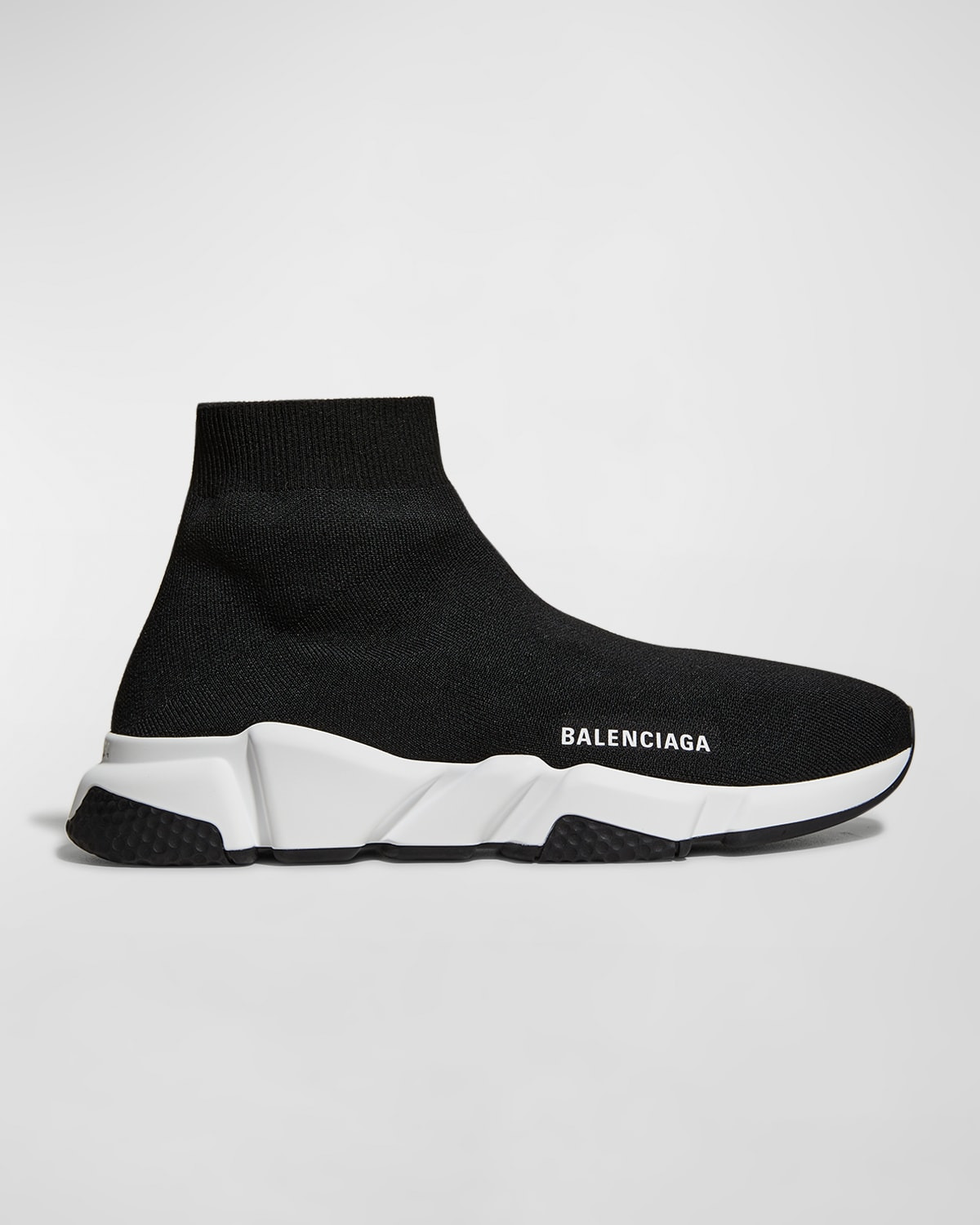 - Balenciaga "Speed 2.0" sneakers in stretch knit with typographic text on side. - Chunky heel. - Reinforced round toe. - Pull-on style. - Bendable rubber sole. - Made in Italy.