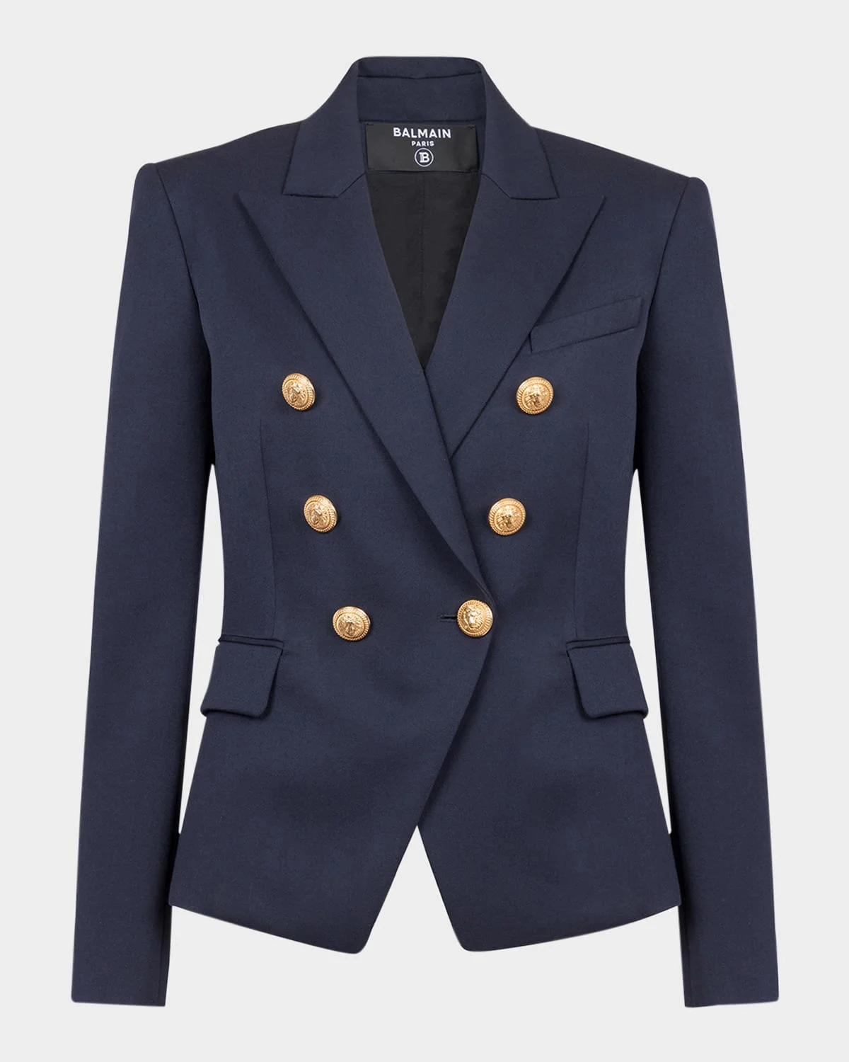 - Balmain jacket featuring signature goldtone buttons - Point collar; double-breasted front - Long sleeves; button cuffs - Chest welt pocket - Hip flap pockets - Slim fit - Hip length - Wool - Made in Italy