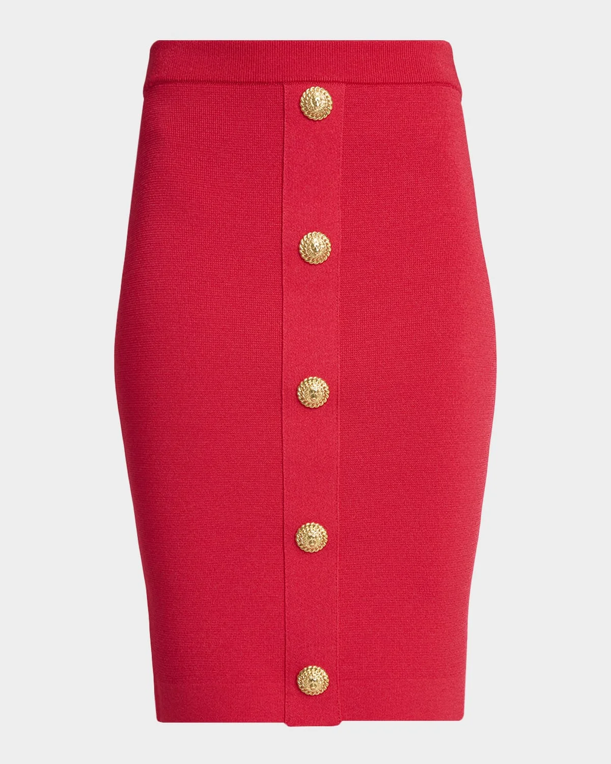Balmain pencil skirt is crafted from compact knit accented with & nbsp;a signature goldtone button front & nbsp; High waist Knee length Pencil silhouette Back zip Viscose/polyester Professional cleaning recommended Made in Italy