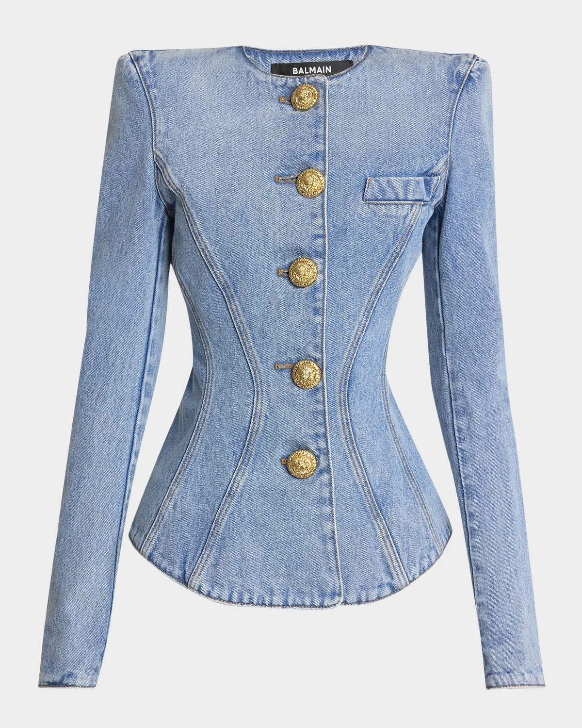 - A signature Balmain silhouette finished with embossed gold-tone buttons in faded denim. - Round neckline - Structured shoulders - Long sleeves - Chest welt pocket - Figure-hugging silhouette - Rounded hem - Button-front - Cotton - Professional cleaning recommended - Made in Italy