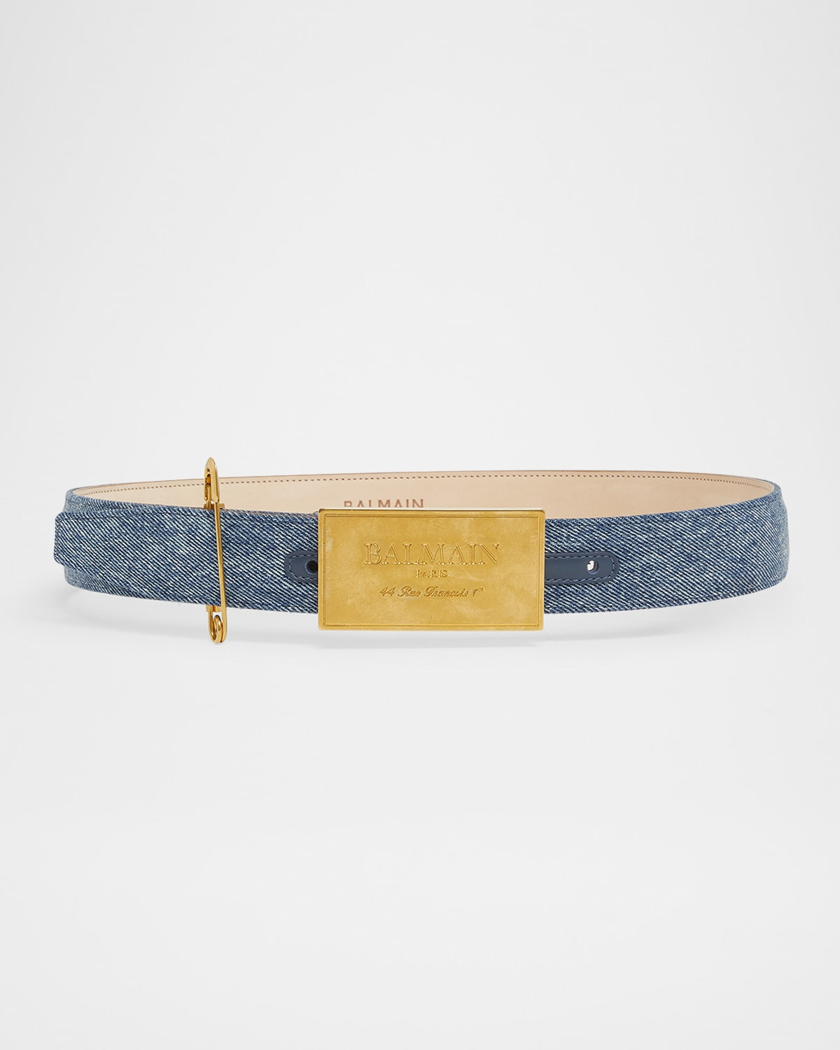 - Balmain denim leather belt with safety pin - Features engraved logo plaque - Adjustable fit - Buckle closure - Leather - Spot clean - Made in Italy