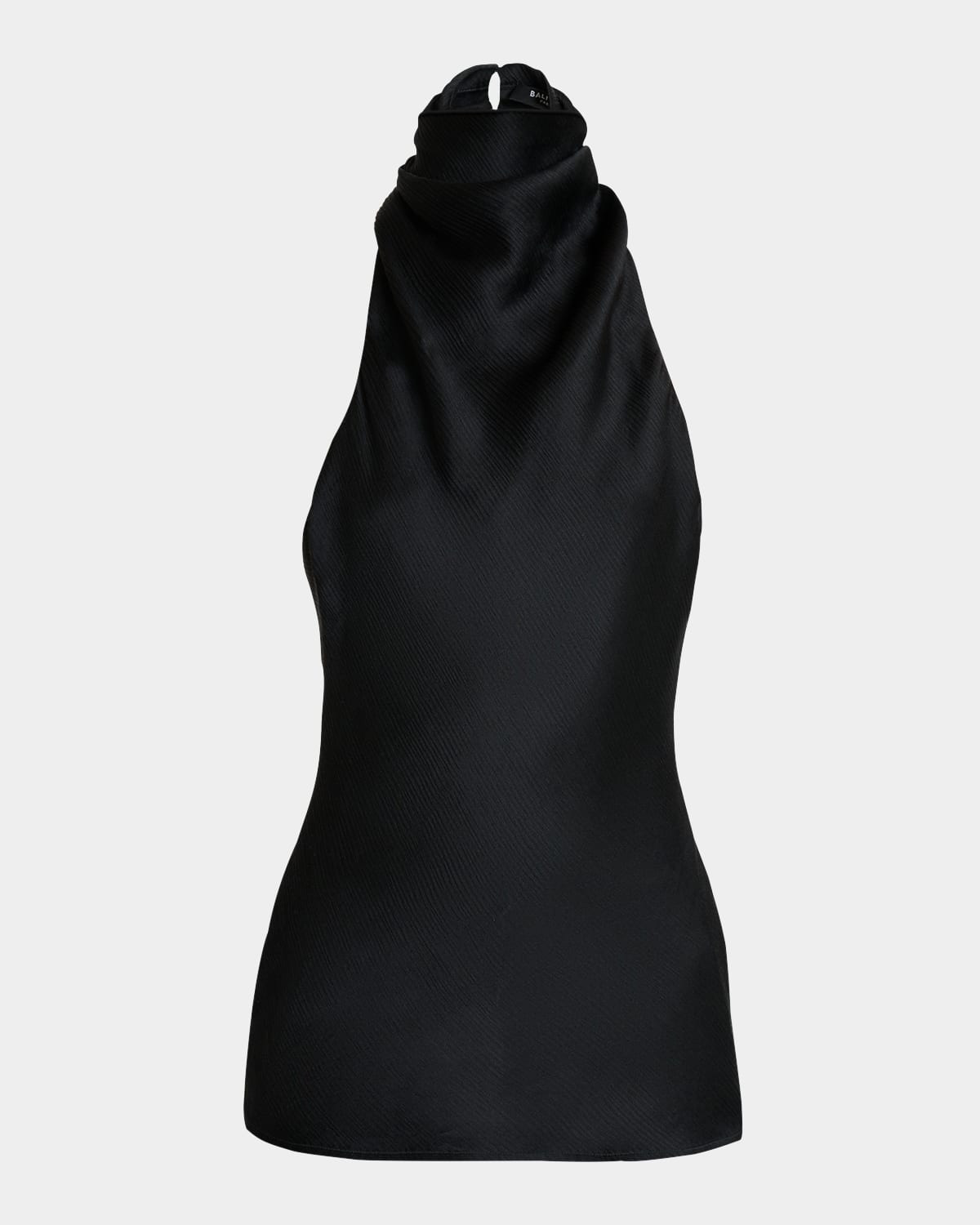 - Balmain crepe satin top in luxurious silk - High cowl neckline with hook closure - Sleeveless - Open back - Classic fit - Hem falls to the hip - Silk - Professional cleaning recommended - Made in Portugal