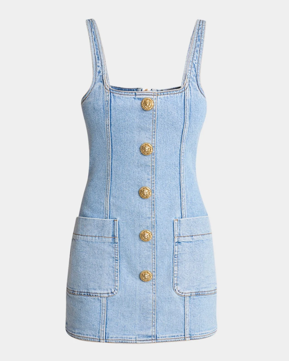 Balmain dress is crafted from a light-wash denim featuring a signature goldtone buttoned front and paneling detail Square neckline Sleeveless Hip patch pockets Sheath silhouette Mini length Back zip Cotton/elastane Professional cleaning recommended Made in Italy