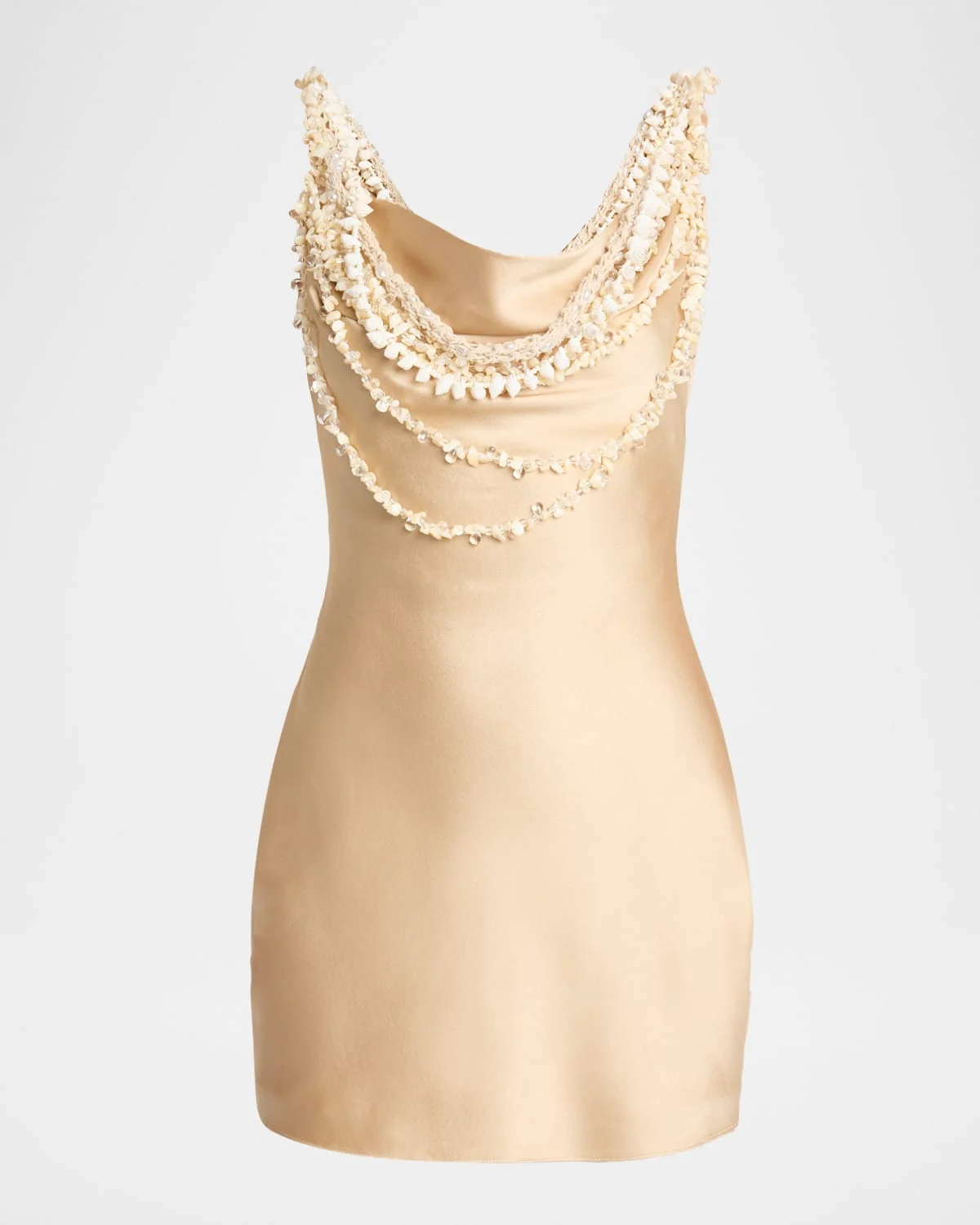 Crafted from fluid satin, this dress from Balmain drapes with strings of shell embellishments at the cowl neckline and dipped back. Cowl neckline Sleeveless Sheath silhouette Mini length Concealed side & nbsp;zip closure Silk Dry clean Imported SIZE & FITModel measurements: 5 & apos;10" tallModel is wearing a US size 4/Small