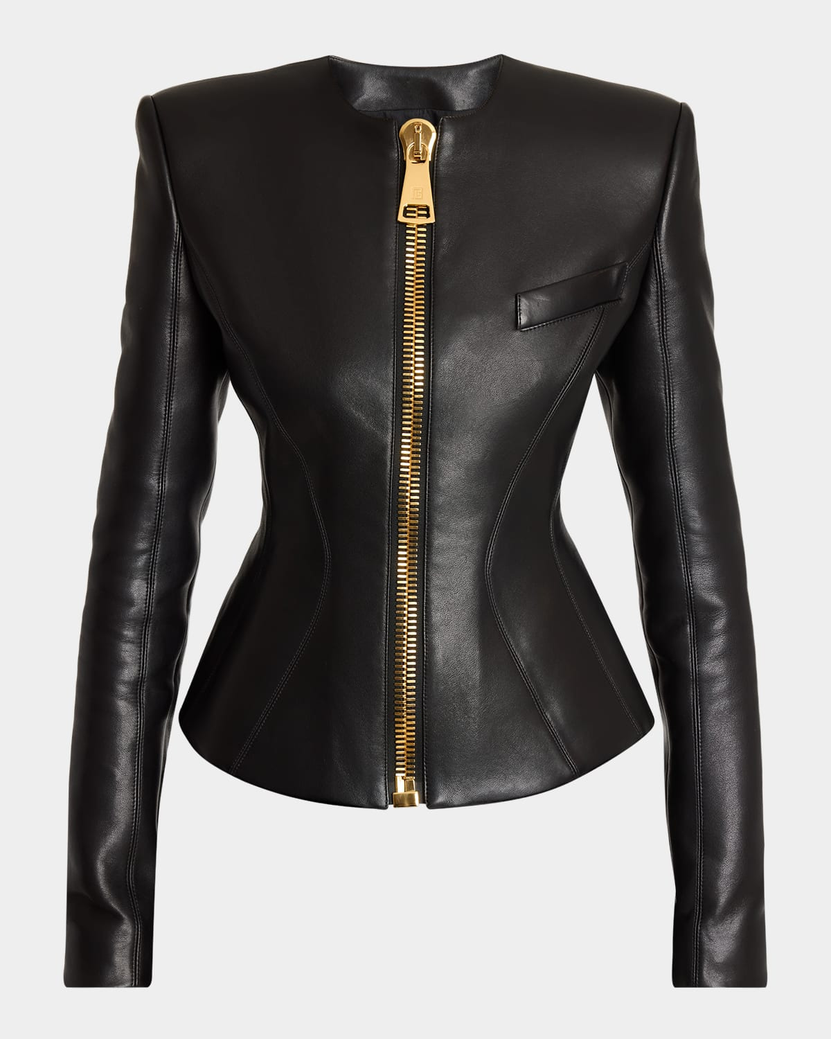 - Crafted from smooth lambskin leather, this Balmain cropped jacket features chunky, gold-tone hardware with signature logo engraving. - Round neckline - Long sleeves with zip cuffs - Chest welt pocket - Fitted silhouette - Peplum hem - Zip-front - Leather - Professional cleaning recommended - Made in Bulgaria