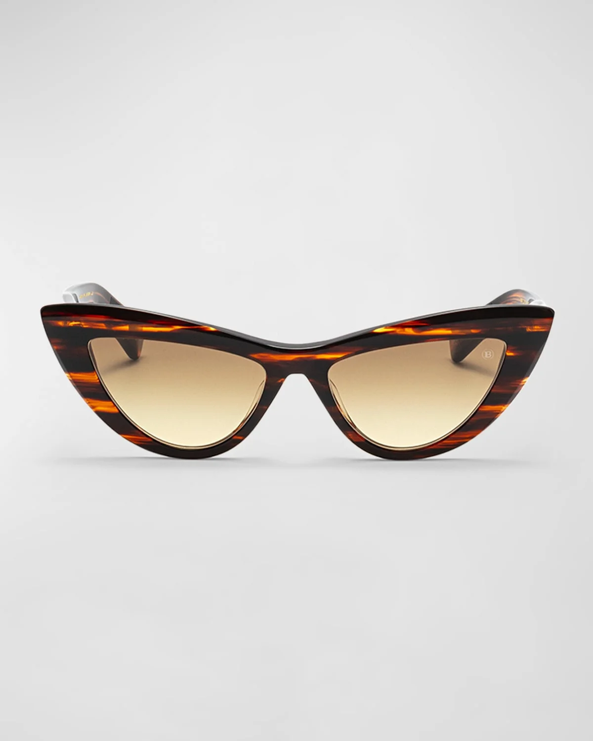 Balmain cateye sunglasses in lightweight titanium frames and acetate Lens/bridge/temple (in mm): 5418145 Gradient lenses; monogram in corner Saddle nose bridge Monogram engraved hinges Thin, tapered arms 100% UVA/UVB protection Made in Japan