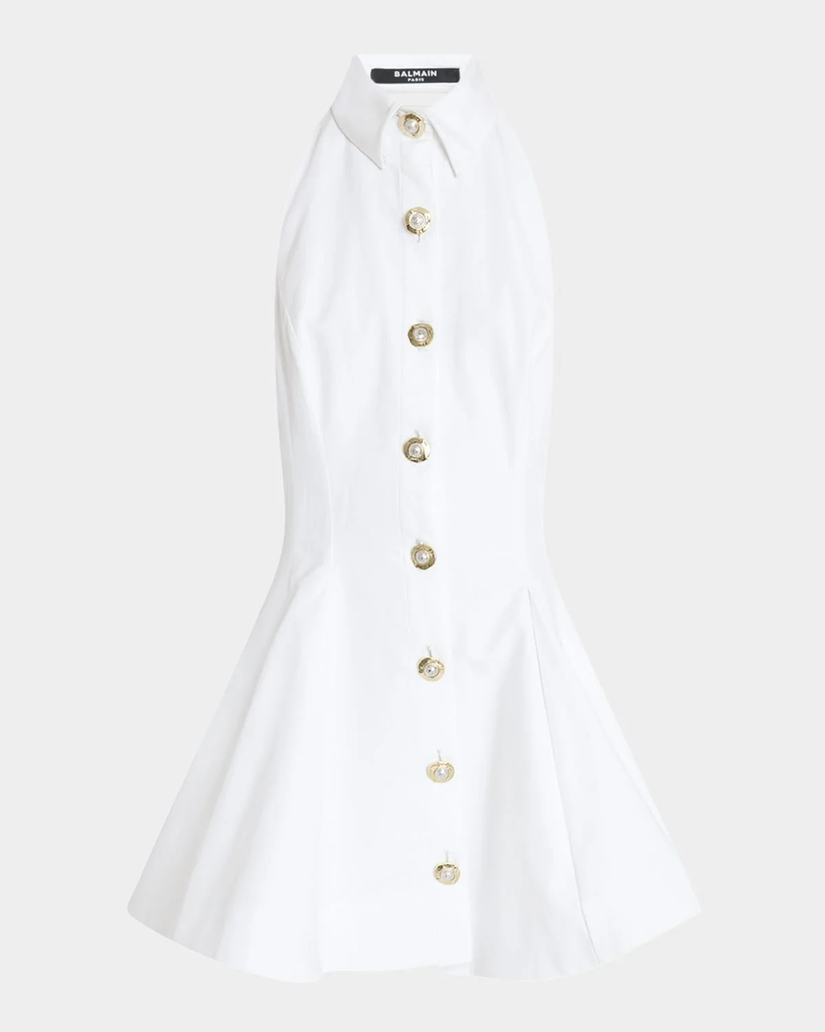- Balmain popeline shirtdress featuring a signature two-tone button front and a pleated skirt - Point collar; halter neckline - Sleeveless - Fit-and-flare silhouette - Mini length - Button closure - Cotton - Professional cleaning recommended - Made in Italy