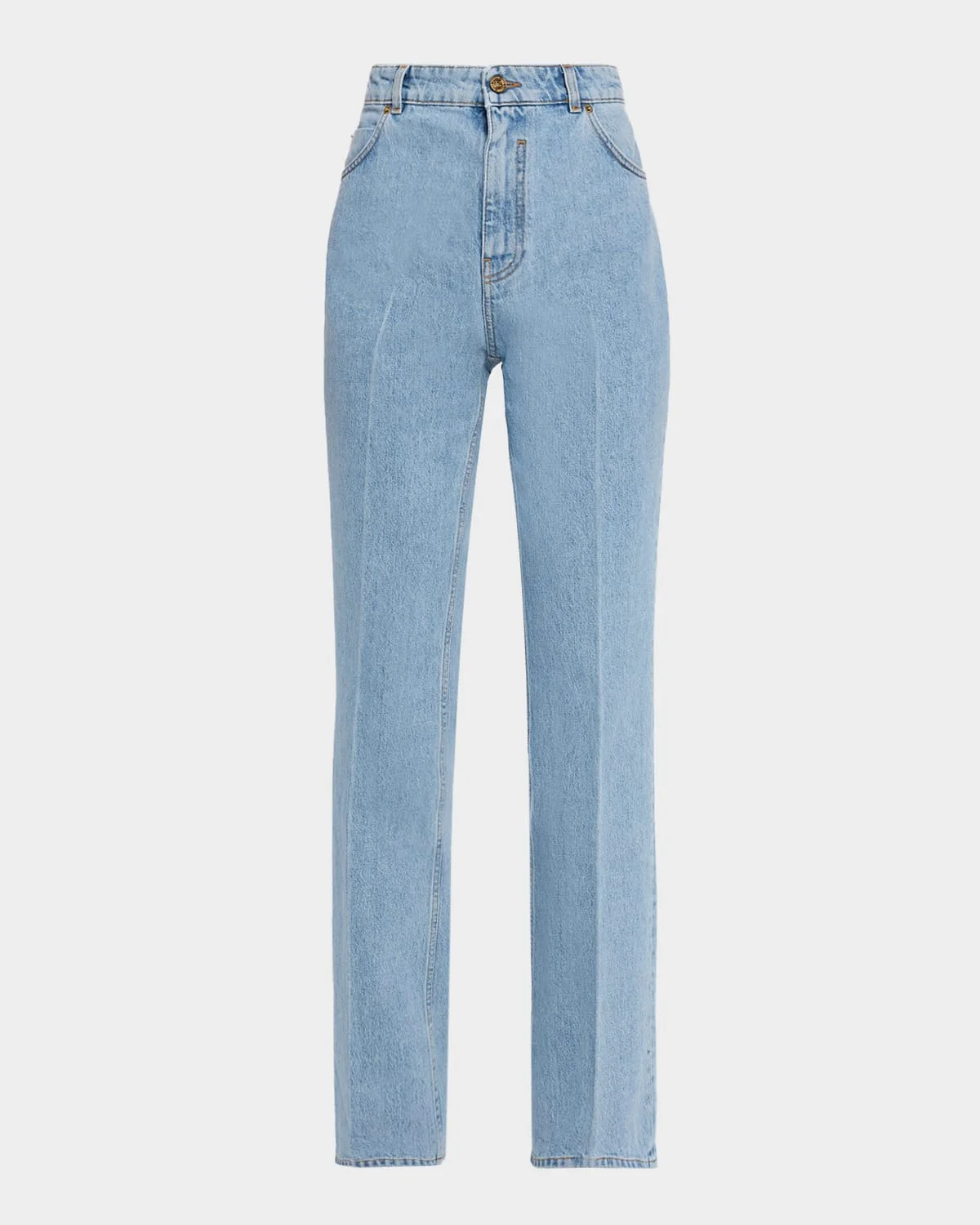 Balmain high-waisted & nbsp;denim jeans finished with & nbsp;PB embroidery on the back pocket. Belt loops at the waist Five-pocket style Printed leather "Balmain Paris" patch Full length Bootcut legs Button; zip fly Cotton Professional cleaning recommended Made in Italy SIZE & FITModel measurements: 5 & apos;10" tallModel is wearing a US size 4/Small