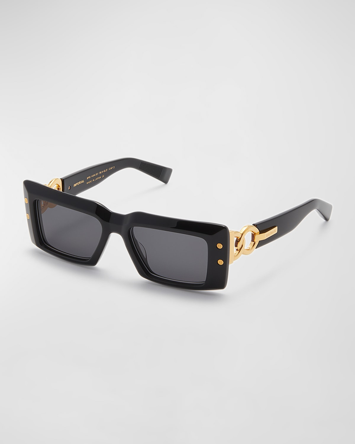 Balmain "Imperial" rectangle sunglasses in acetate and titanium Features B monograms on frames Lens/bridge/temple (in mm): 5317143 Mirror lenses Saddle nose bridge Chain accent on hinges Logo on temples Wide, tapered arms 100% UVA/UVB protection Made in Japan