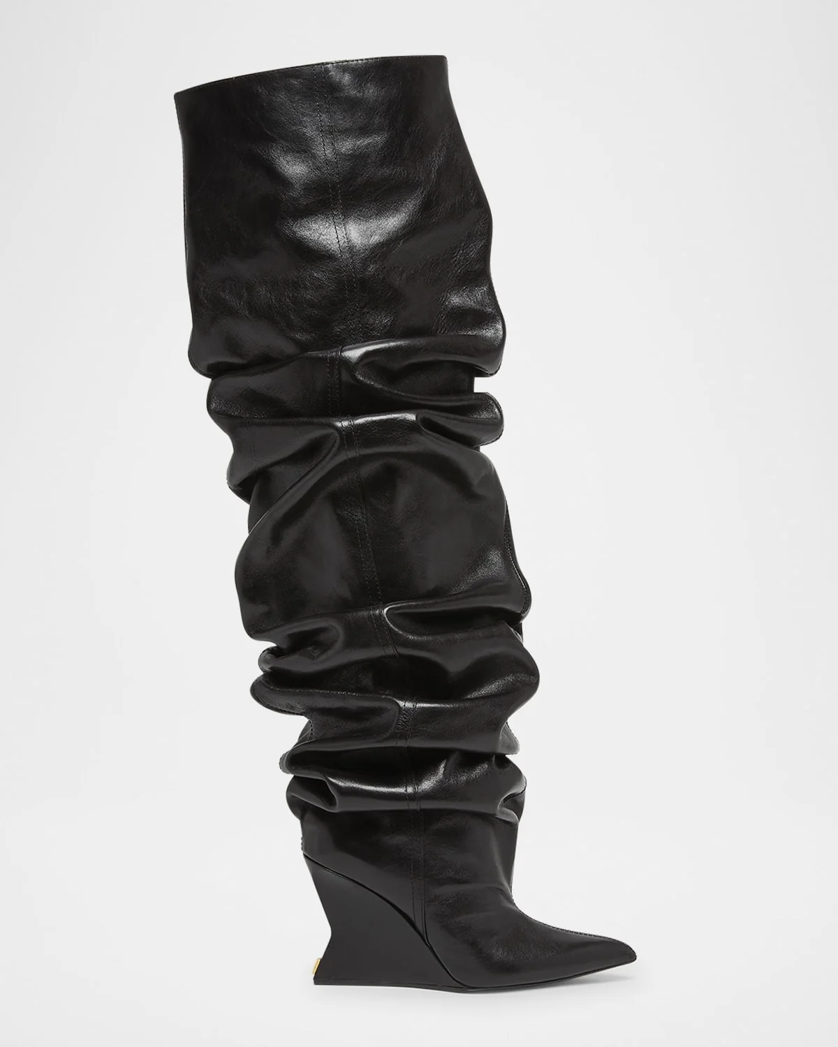 - Crafted with a shiny calf leather upper, these over-the-knee boots by Balmain feature textural gaiter-style draping that can be pulled up or pushed down for versatile styling - 3.75 in / 95 mm wedge heel - Pointed toe - Pull-on style - Leather outsole - Spot clean - Made in Italy