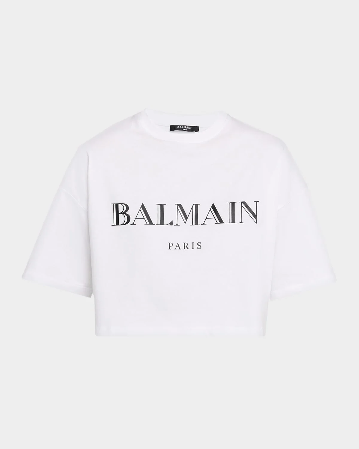Cut for a boxy fit, this Balmain Tshirt flaunts a cropped silhouette on a cotton jersey styled with the brand logo printed on the chest Balmain's capsule collection delivers elevated essentials crafted from premium cotton, combining everyday comfort with bold, signature branding. Relaxed silhouettes and vintageinspired details bring a refined edge to classic streetwear staples. Crew neckline Short sleeves Drop shoulders Boxy fit Cropped length Pullover style Cotton Dry clean Made in Portugal