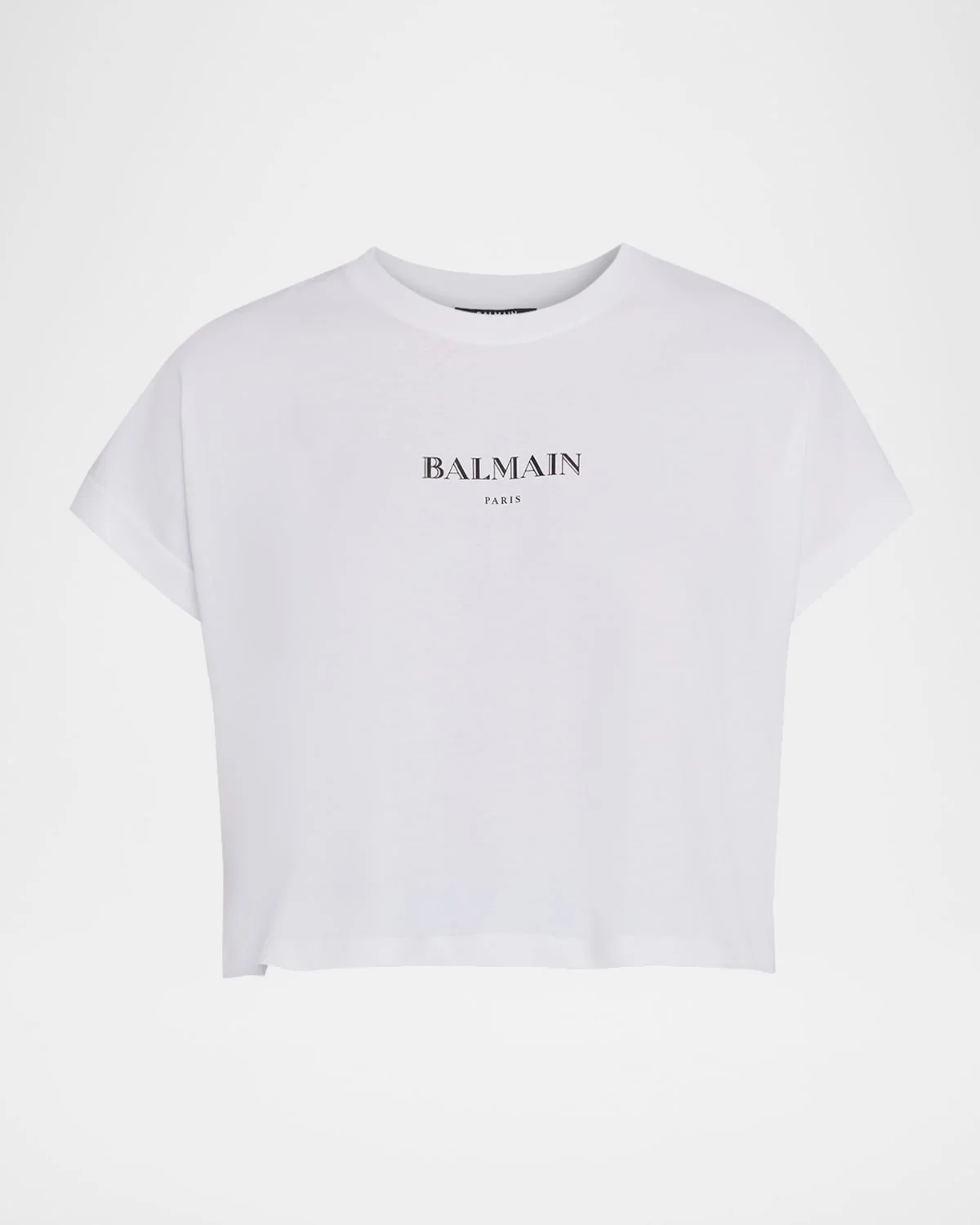 This Balmain Tshirt flaunts a cropped silhouette crafted from cotton, is styled with the brand logo printed on the chest Balmain's Capsule delivers elevated essentials crafted from premium cotton, combining everyday comfort with bold, signature branding. Relaxed silhouettes and vintageinspired details bring a refined edge to classic streetwear staples. Crew neckline Short sleeves Rolled cuffs Relaxed fit Cropped length Pullover style Cotton Dry clean Made in Portugal