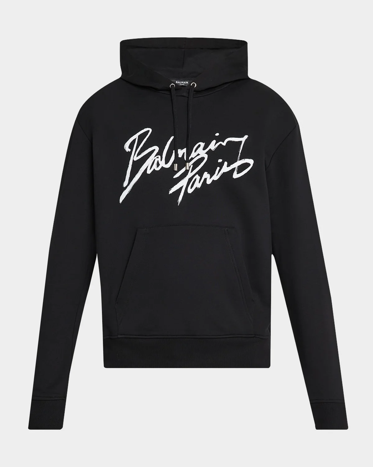 This Balmain cotton hoodie highlights a romantic logo signature across the chest. Hooded drawstring neckline Kangaroo pouch Ribbed cuffs and hem Dropped shoulders Pullover style Classic fit Cotton Professional cleaning recommended Made in Portugal