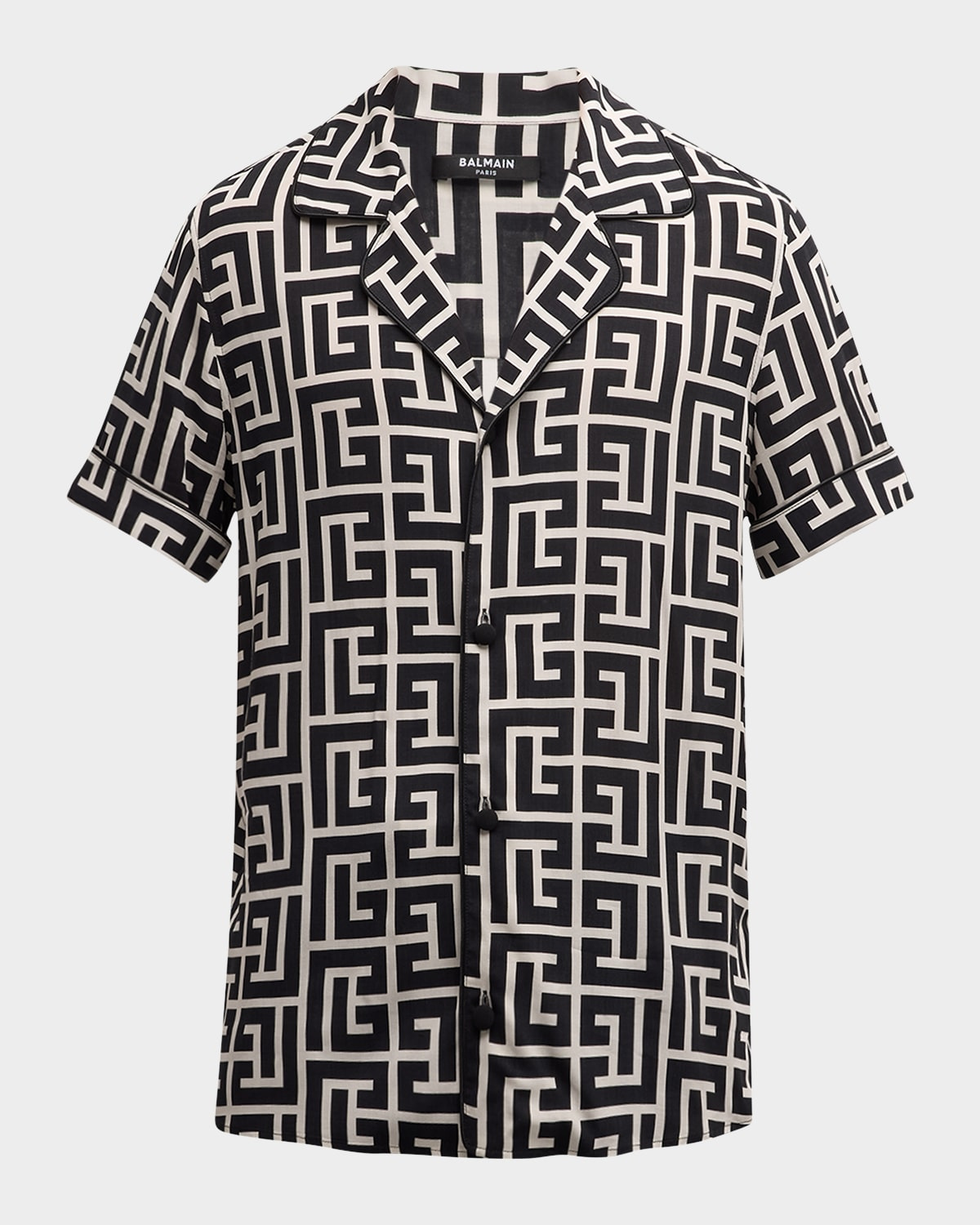- Balmain pajama shirt with allover monogram print - Notched collar - Button closure - Cuffed short sleeves - Relaxed fit - Viscose - Made in Poland - Model is 6'1"/185cm.