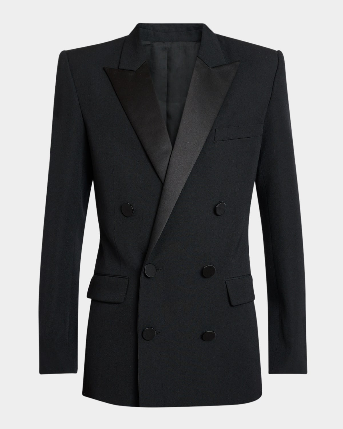 - Balmain blazer jacket defined by lustrous satin lapels and covered buttons - Peak lapels - Double-breasted front - Chest welt pocket - Hip flap pockets - Structured shoulders - Long sleeves - Four-button cuffs - Single-vented back - Straight cut with fitted waist - Cotton - Professional cleaning recommended - Made in Bulgaria
