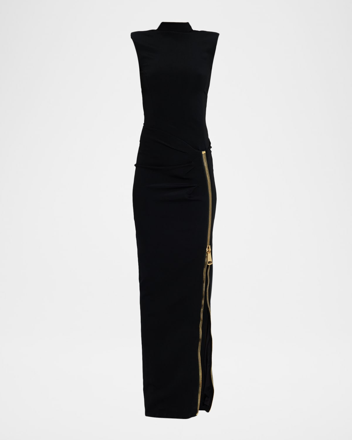 - Exuding sultry architectural drama with precision tailoring, this Balmain dress is crafted in a sleek jersey, embracing the body in a sculpted silhouette with shoulder pads and a striking zipped front slit with an oversized engraved slider - Mock neckline - Sleeveless - Body-skimming silhouette - Floor length - Back zip - Viscose/nylon/polyamide/elastane - Professional cleaning recommended - Made in Portugal