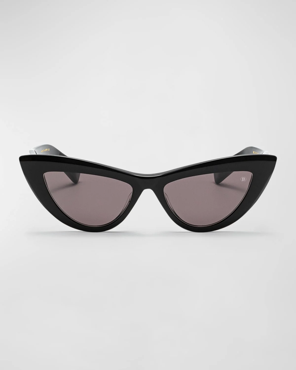 Balmain cateye sunglasses in lightweight titanium and acetate Lens/bridge/temple (in mm): 5418145 Solid lenses; monogram in corner Saddle nose bridge Monogram engraved hinges Thin, tapered arms 100% UVA/UVB protection Made in Japan
