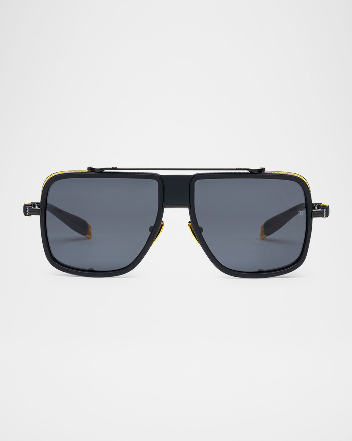 - Balmain "O.R." aviator sunglasses in acetate and titanium - Eye/bridge/temple (in mm): 59-16-140 - Brow bar - Solid lenses - Saddle nose bridge - Thin, tapered arms - Classic monogram at lens - Acetate/titanium - 100% UVA/UVB protection - Made in Japan - Proposition 65 warning for California residents